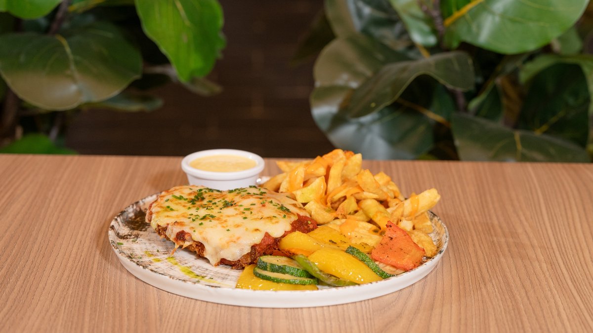 • Chicken Schnitzel • Honey mustard • Potato fries • Mozzarella • Melted cheddar sauce • Grilled vegetables