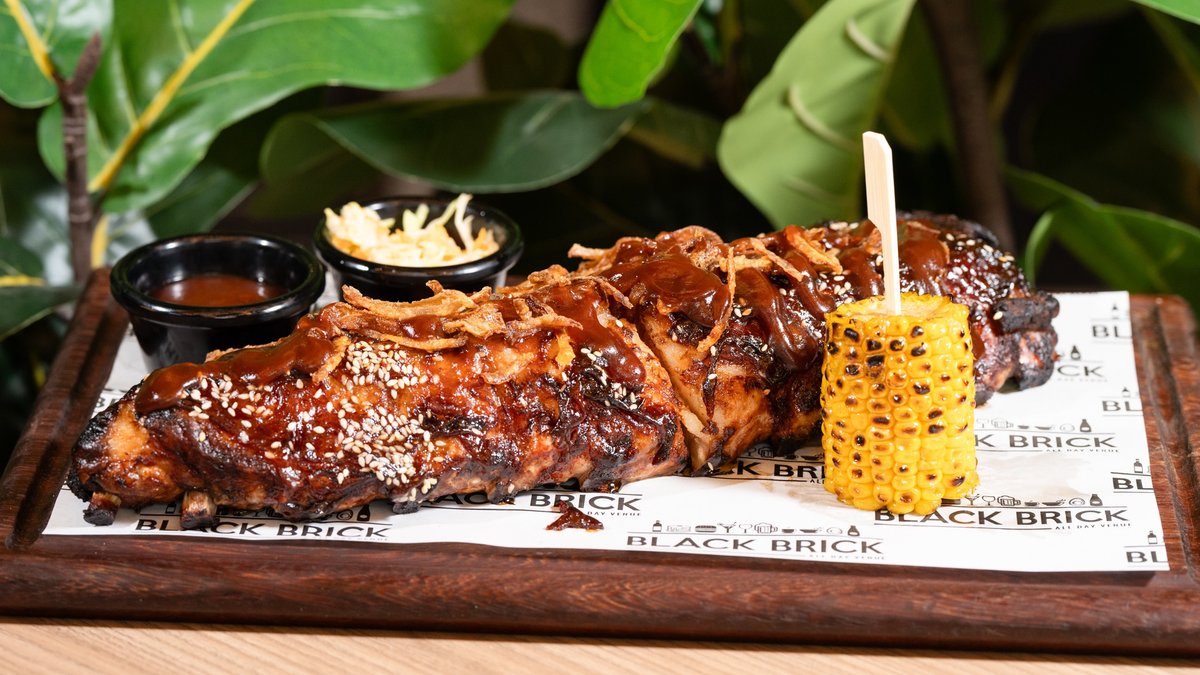 • Ribs • Barbecue sauce • Corn • Potato fries • Coleslaw • Crispy onion