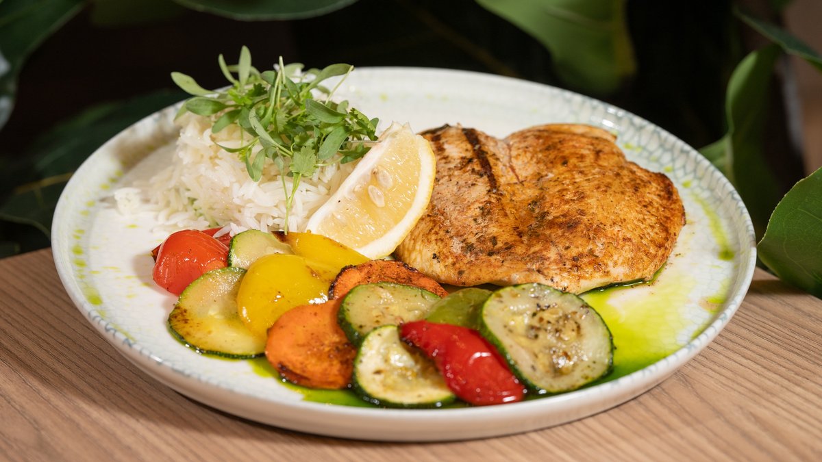 • Rice • Grilled vegetables • Green oil • Chicken fillet • Micro leaves • Lemon