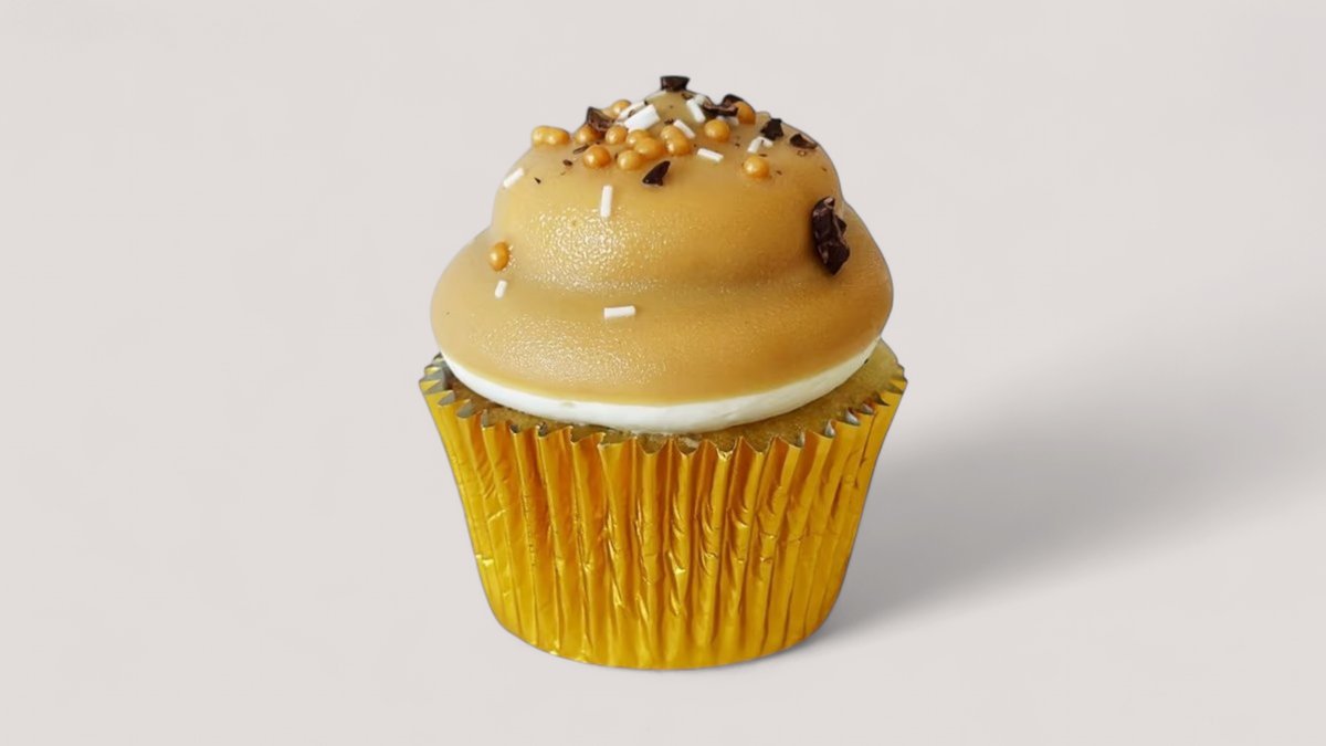 A soft vanilla cupcake with a salted caramel surprise, covered in golden caramel chocolate – luscious, golden, and unforgettable.