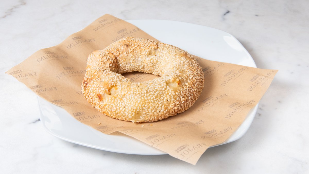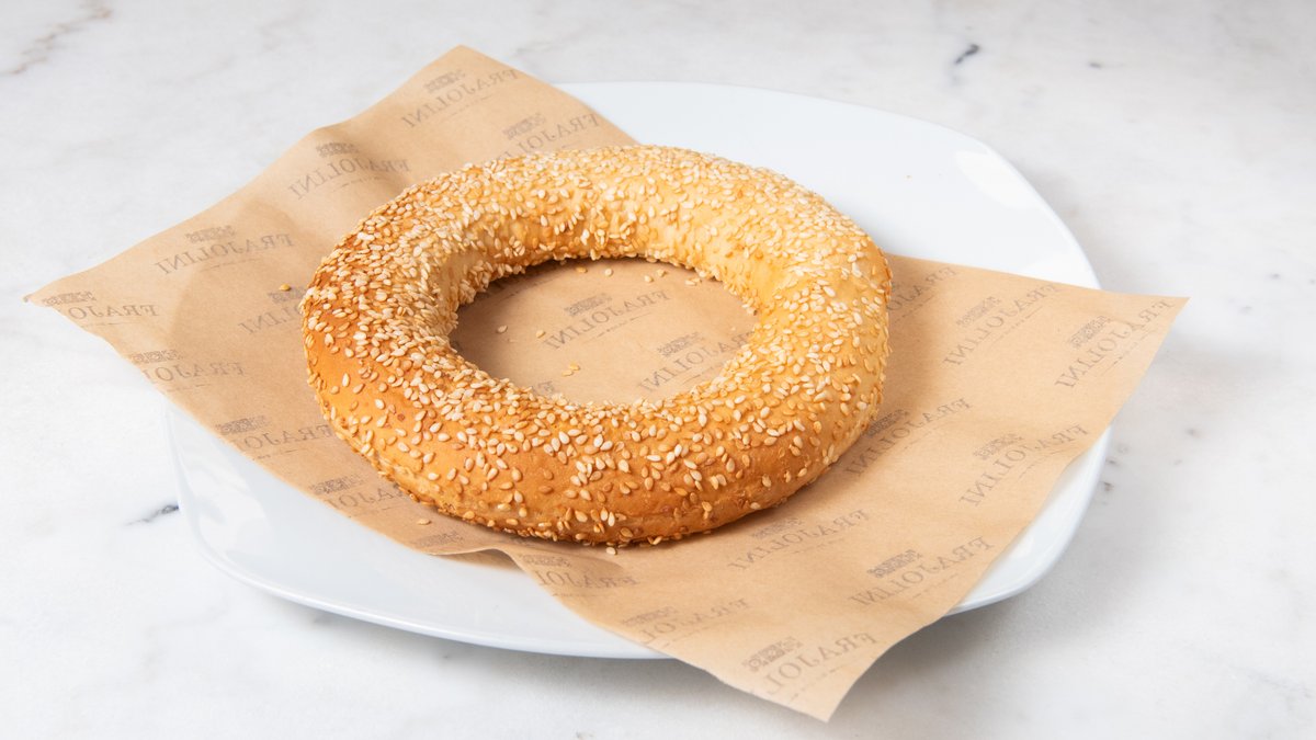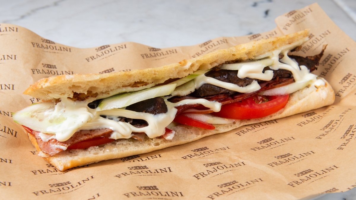 Ciabatta bread with lountza bacon, sausage, edam cheese, halloumi, tomato, cucumber and mayonnaise