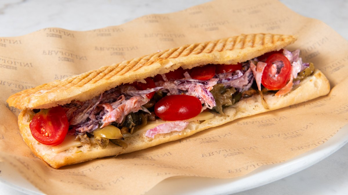 Ciabatta bread with mixed grilled vegetables, halloumi, cherry tomatoes and colesaw