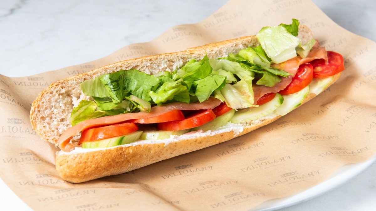 Whole wheat baguette with lettuce, smoked salmon, tomato, cucumber and cream cheese sauce