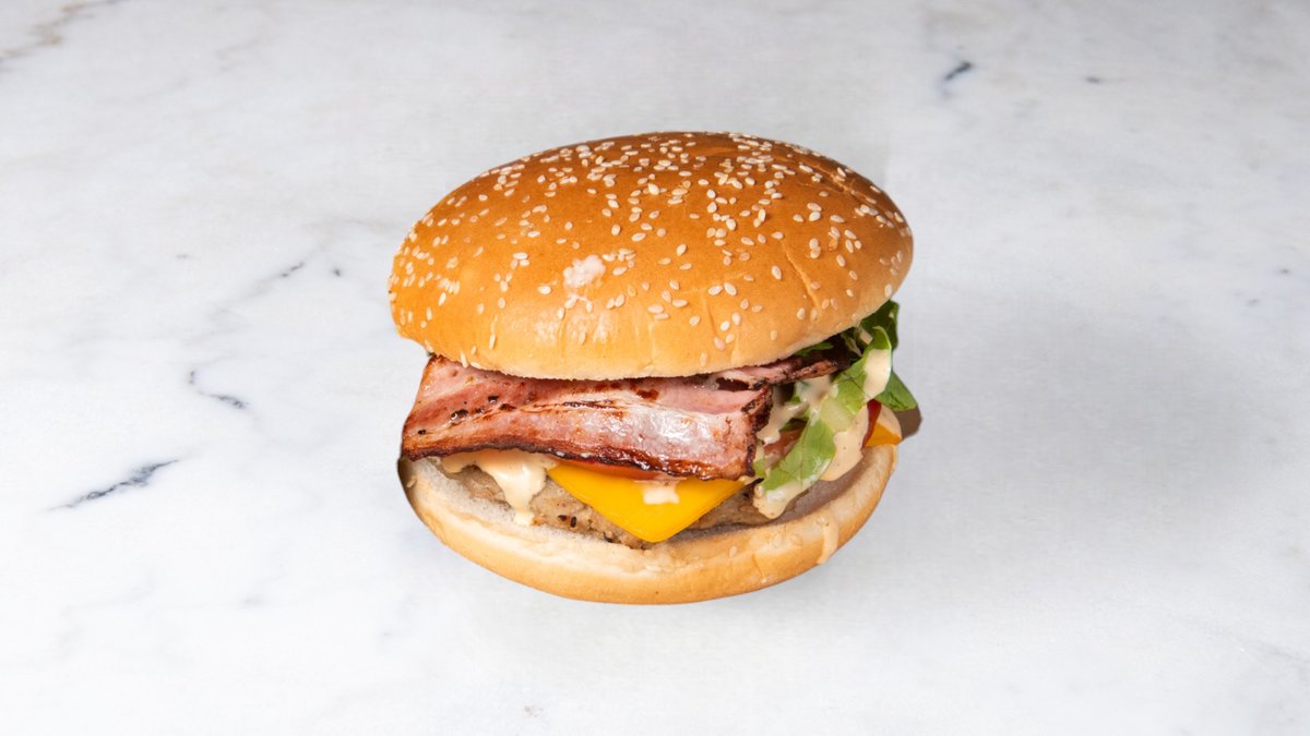 Ciabatta bread with grilled chicken,bacon, egg, edam cheese, lettuce, tomato and cocktail sauce
