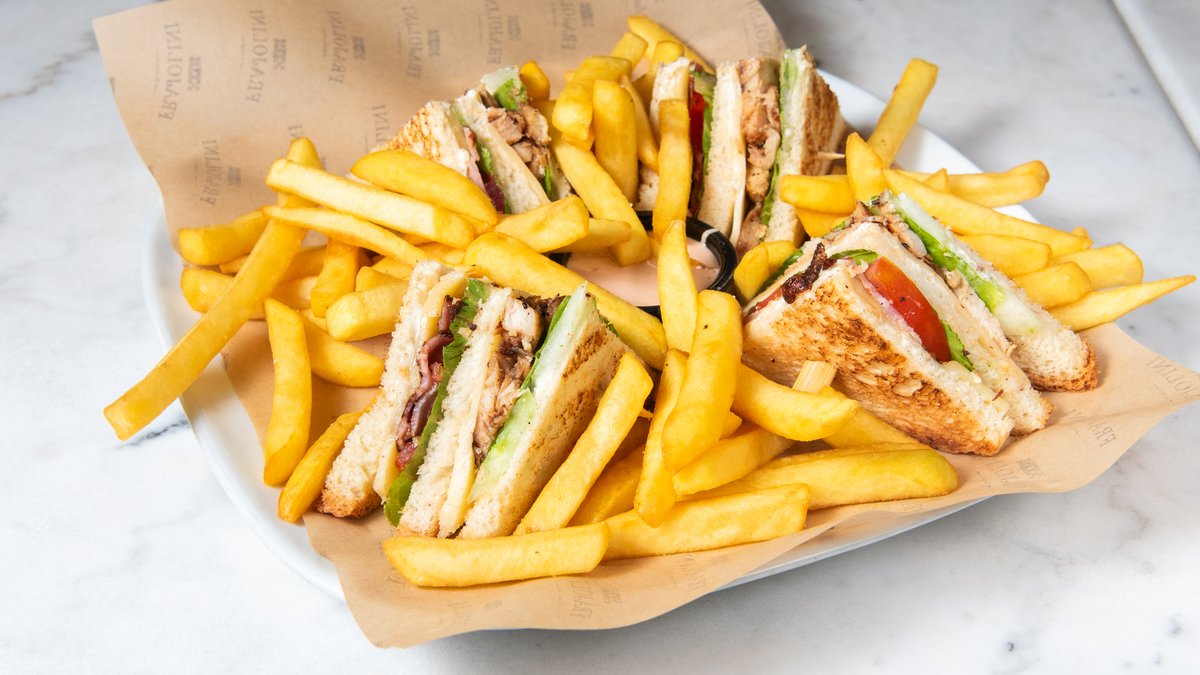 Ciabatta bread with chicken burger, edam cheese, ham, tomato, french fries and remoulade sauce