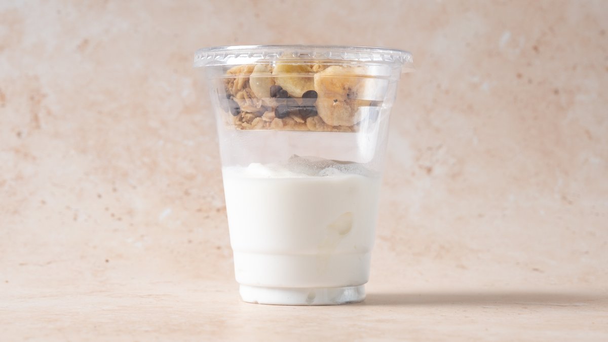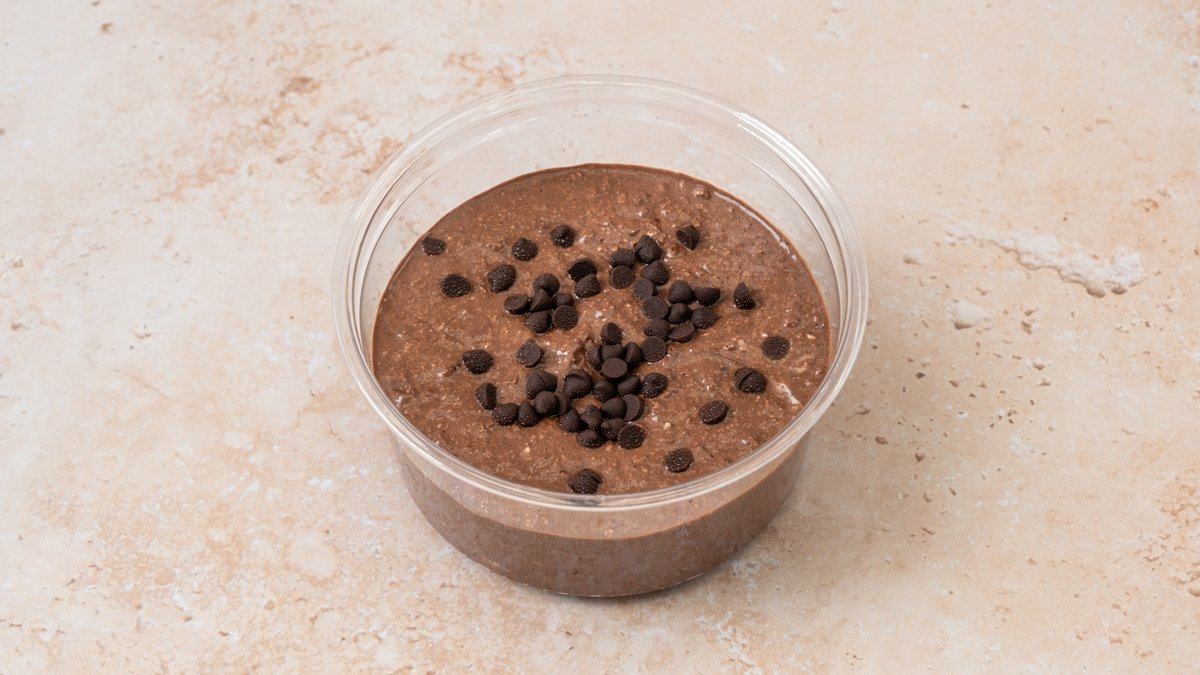 1 Cup of pineapple, 1 scoop vanilla, 1/2 banana, 1 spoon of chia seeds, 50g yogurt, 60ml milk with zero calories and 1 spoon of choco chips
