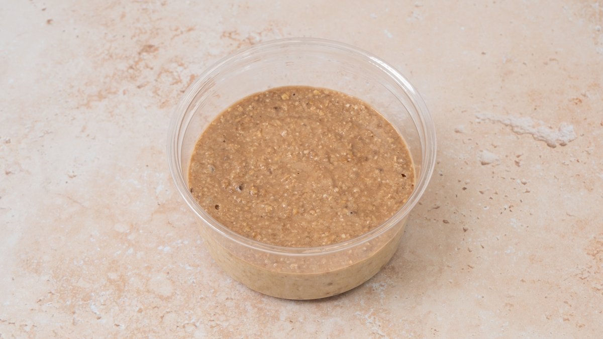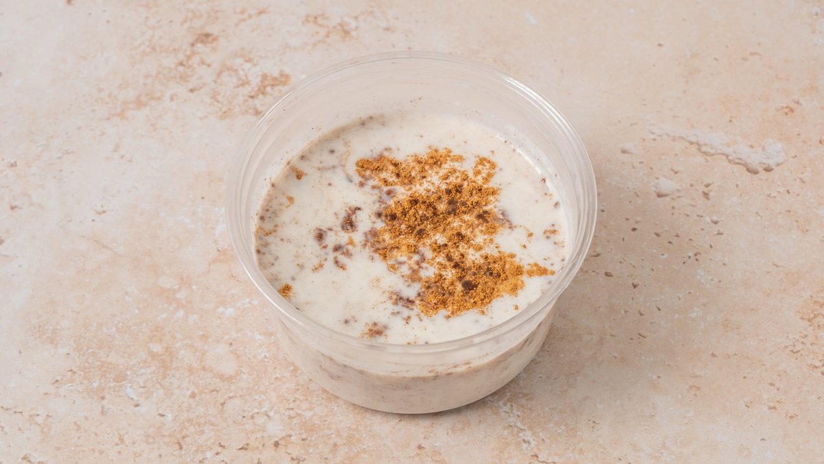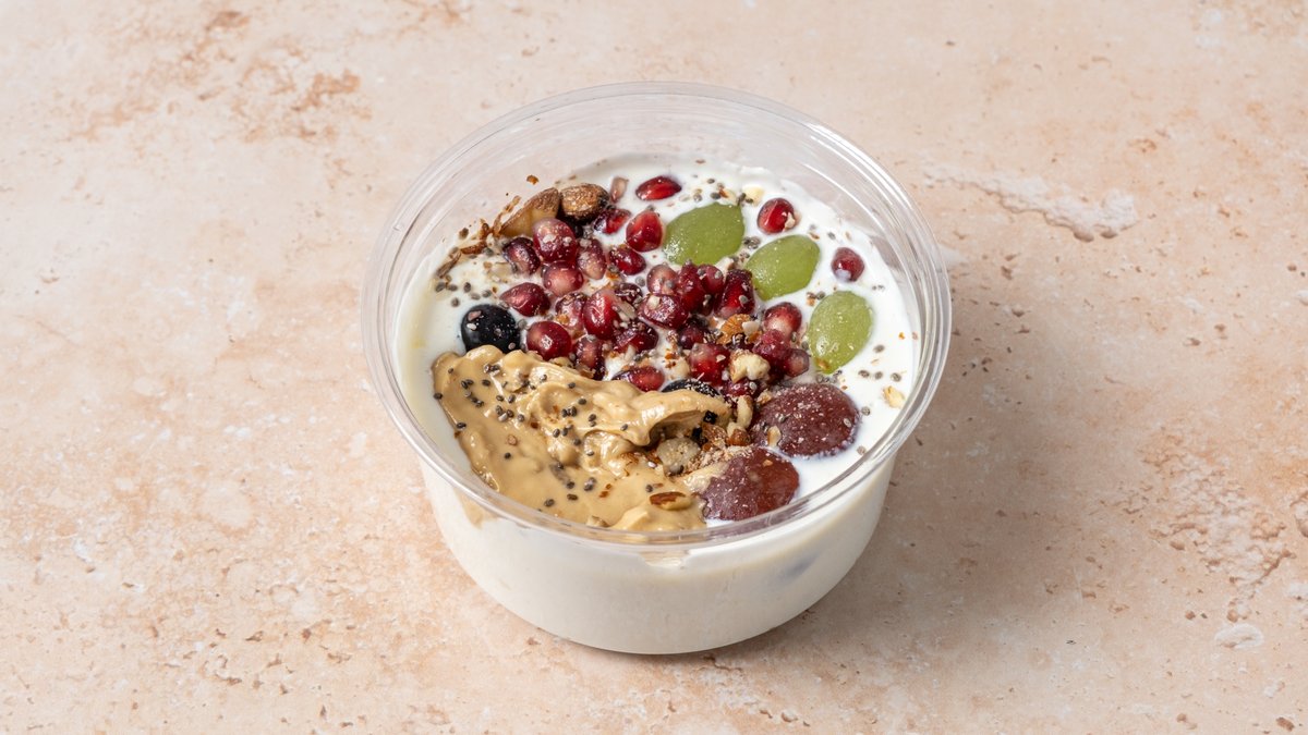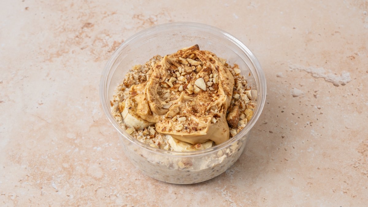 Banana, 150ml coco milk, 120g yogurt, 1 spoon of almond butter, 1 scoop of vanilla protein and ice