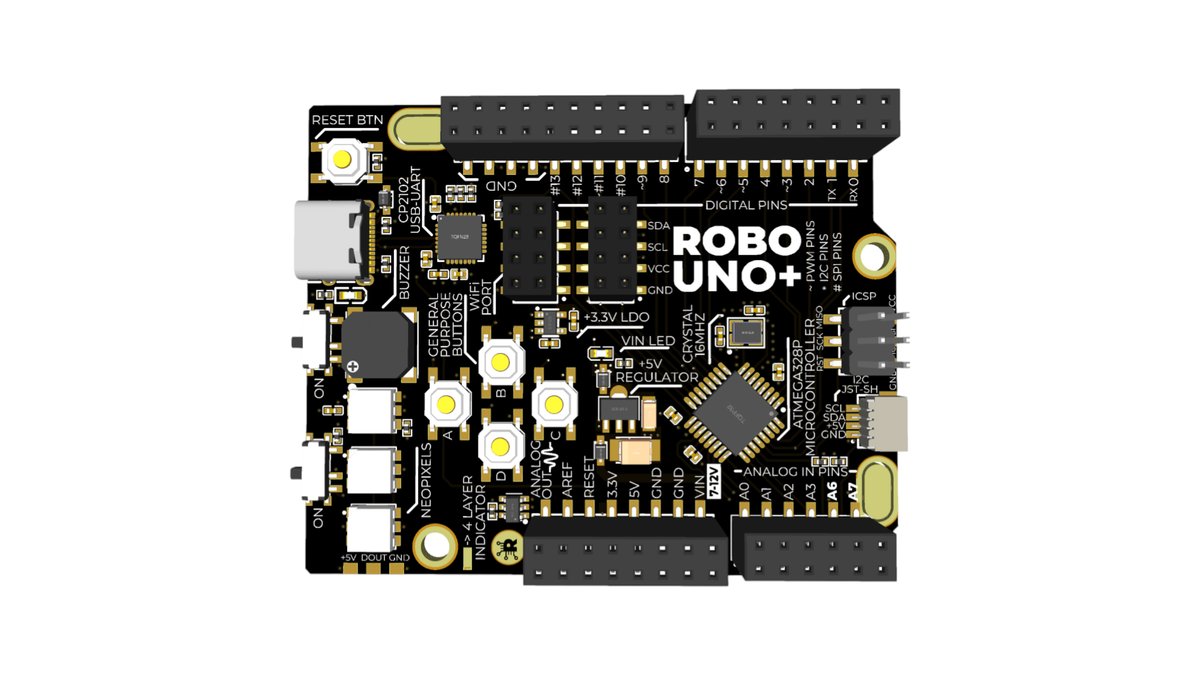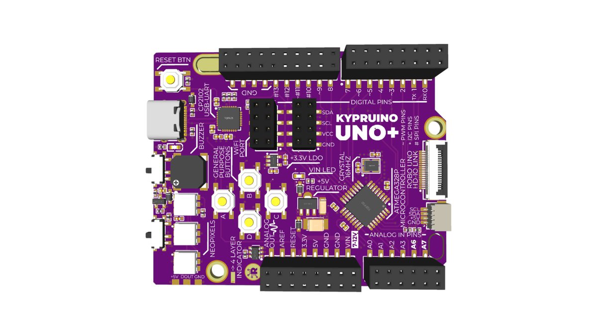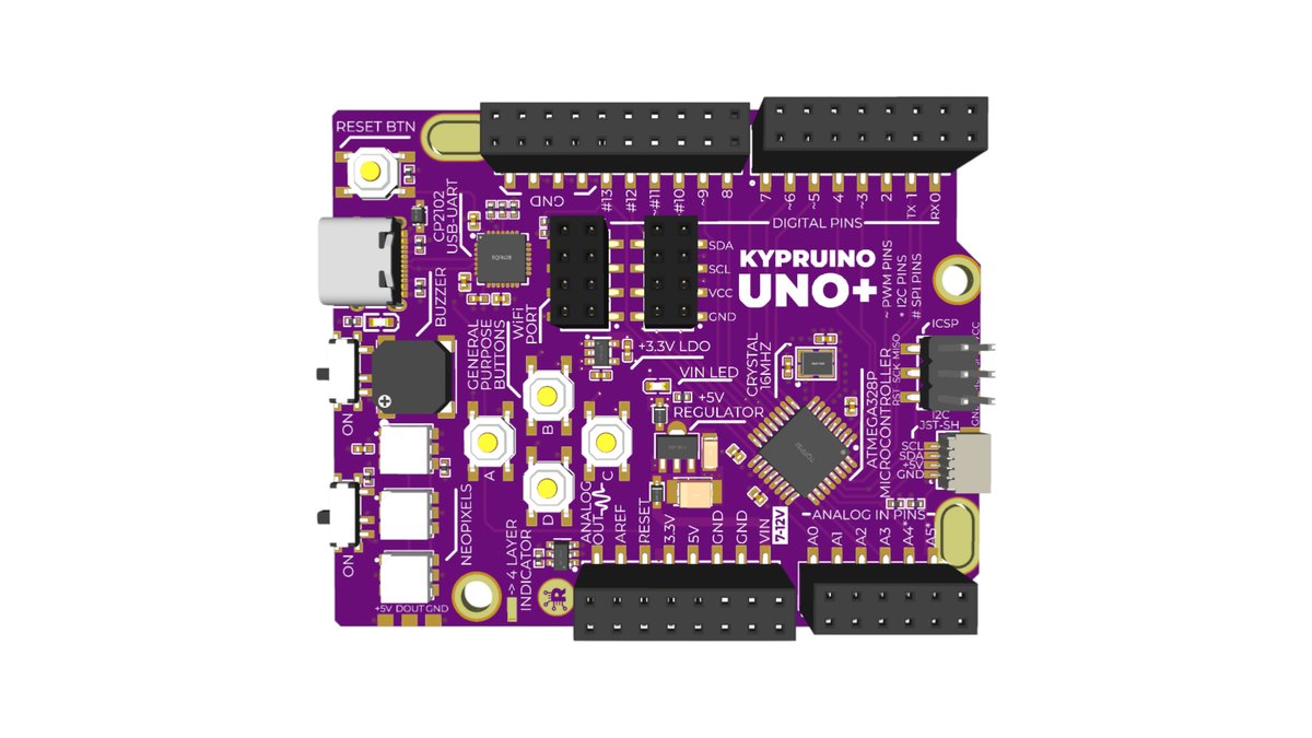 Kypruino UNO+ v0.8.1 (Arduino UNO R3 Compatible) – USB-C 4-Layer PCB 12-bit DAC RGB Buttons Buzzer I2C Plug-&-Play **Preorder**