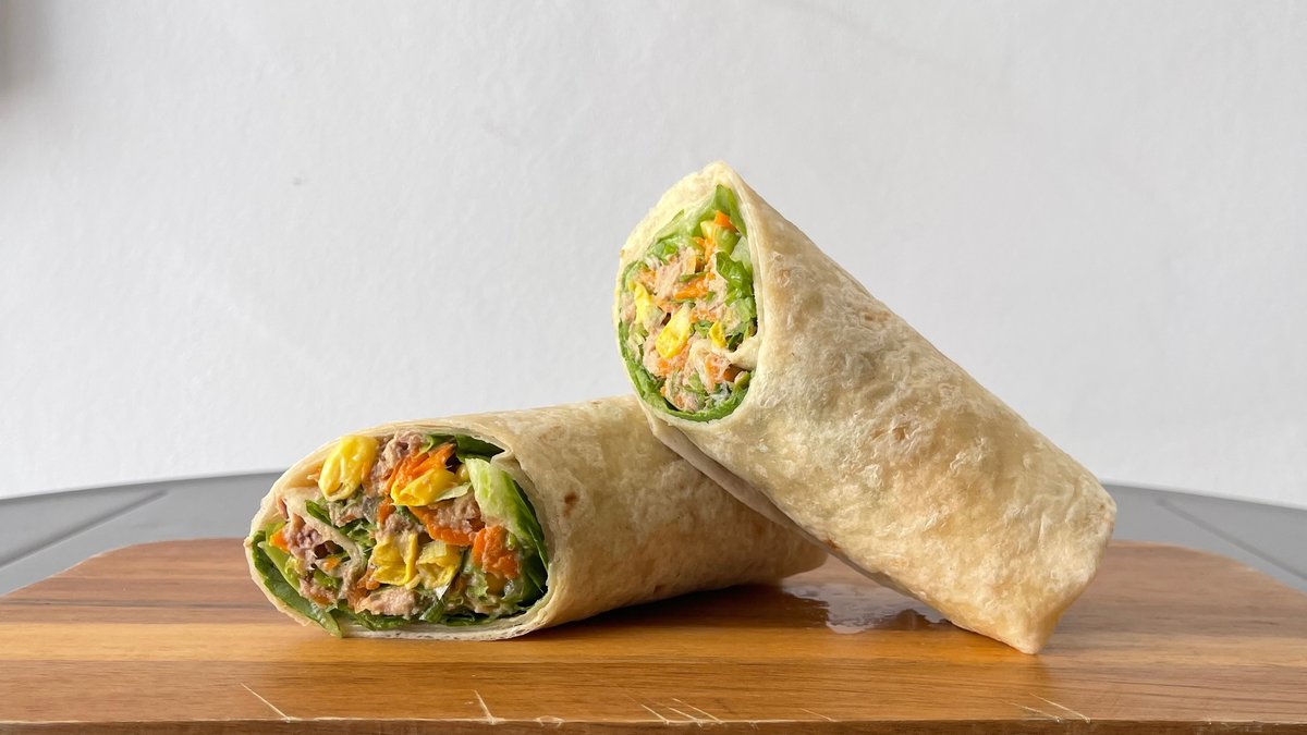 Tortilla, Tuna, Lettuce, Carrot, Fresh Onion, Sweet Corn, Lemon, Vegan Mayo