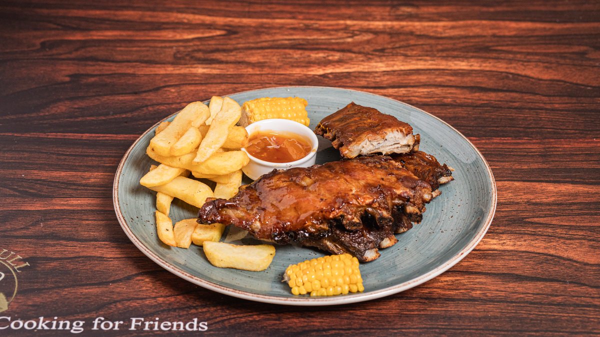 Delicious smoked spare ribs slow cooked in our smoked oven served with sweet and sour sauce, chips, corn on the cob and Texas slaw