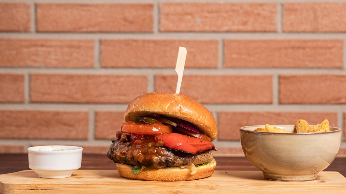 250 gr burger grilled cooked medium and coated with BBQ sauce, served on a toasted brioche with lettuce, tomato, pickle slices wedges and Texas slaw