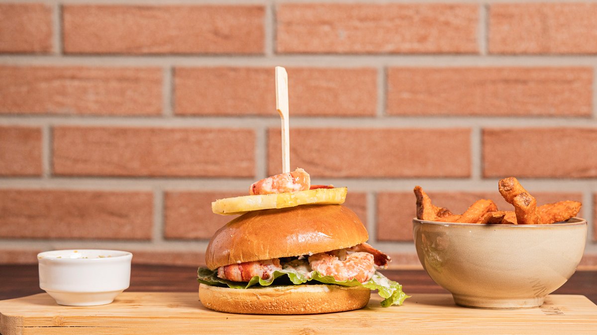 Delicious 5 breaded Prawns , served on a toasted brioche with lettuce sweet chilly sauce and sweet potato chips