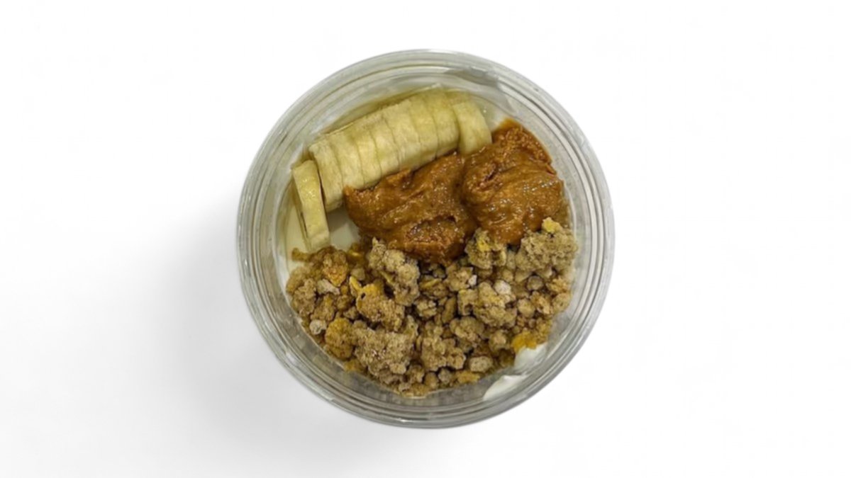Delicious healthy yogurt 2% fat made with granola, banana, handmade peanut butter spread, maple syrup. May contain traces of soy, nuts, gluten.