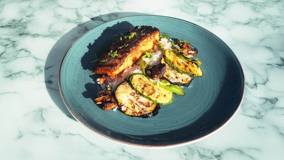 300-350 γρ σολομό σερβιρισμένο με σάλτσα πορτοκαλιού, ρύζι λαχανικών ή πατάτες της επιλογής σας, ψητά λαχανικά και ελληνική πίτα