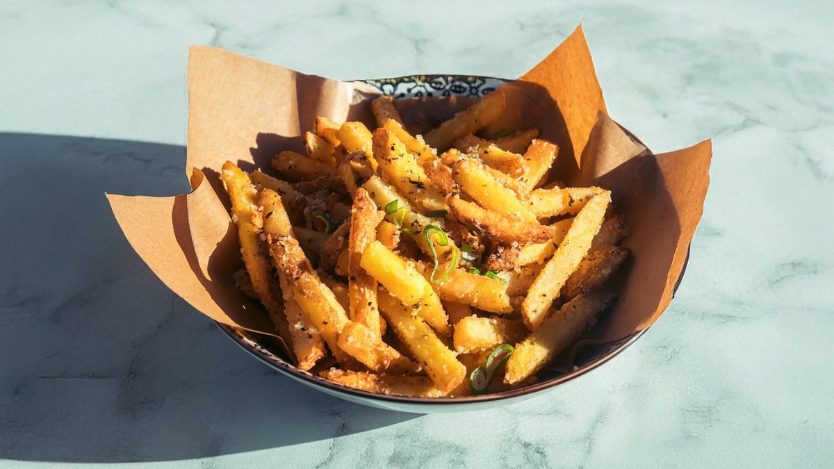 Τραγανό φαλάφελ με πατάτες ή ρύζι, φρέσκια σαλάτα και δροσερό σώς γιαουρτιού ή χούμους στο πλάι.