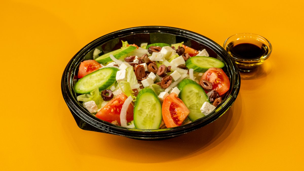 Lettuce, fresh tomato, cucumber, onion, black olives, green pepper, feta cheese, with olive oil & balsamic dressing