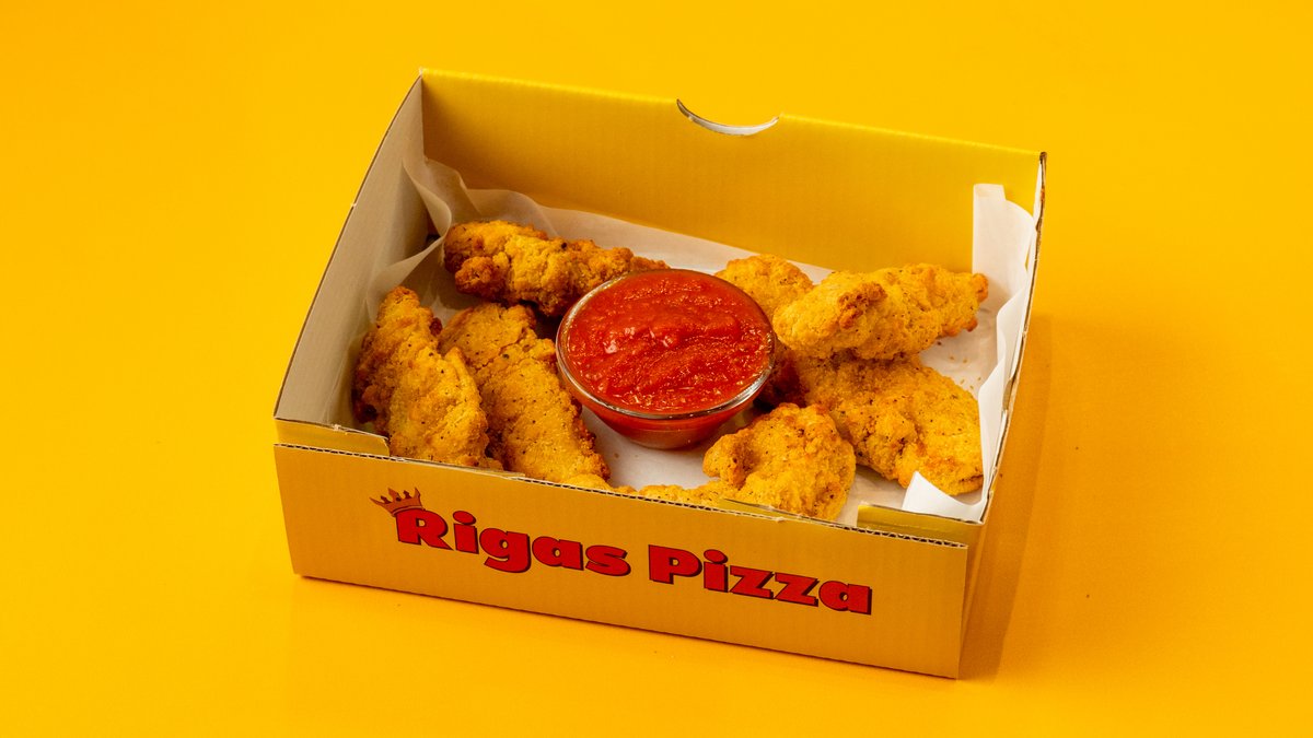 6 pcs tender breaded chicken fillet strips, oven-baked to perfection. Served with a sauce of your choice: Sweet Chili, Sweet & Sour Sauce, Rigas Tomato Sauce, or Barbecue Sauce