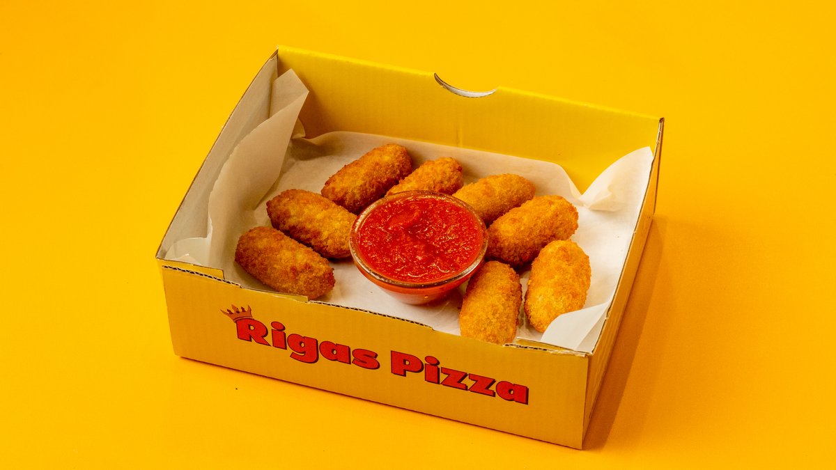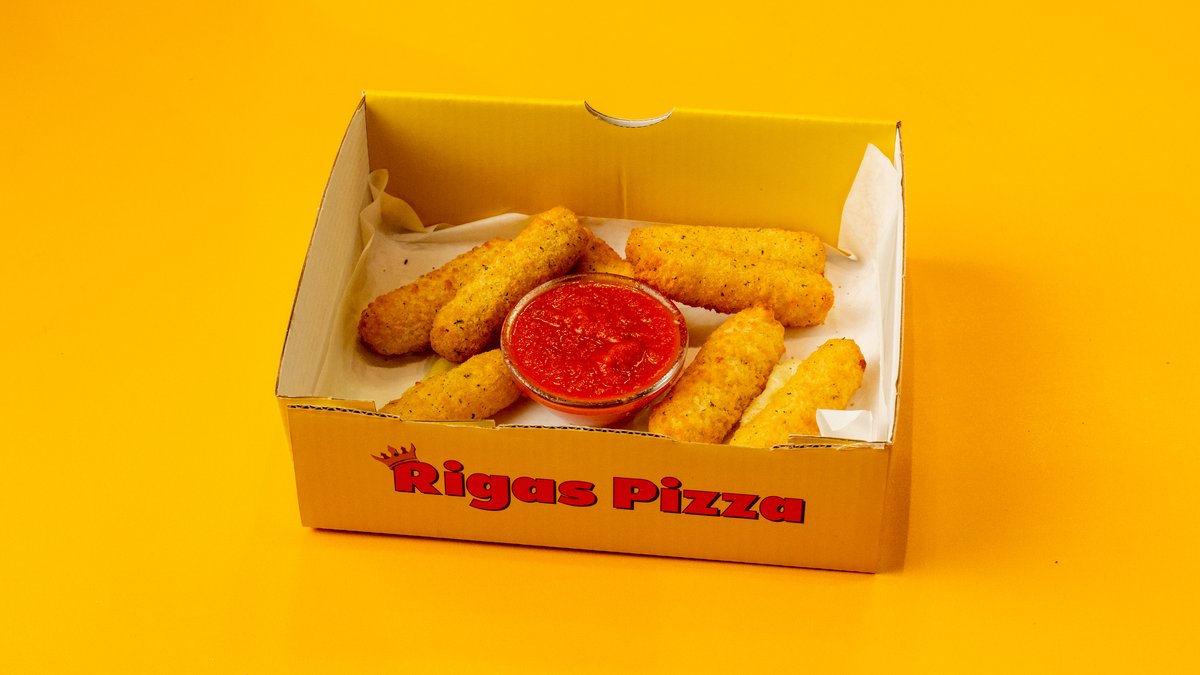 8 pcs irresistible mozzarella sticks with melted mozzarella, coated in a flavorful crispy crust. Served with Rigas tomato sauce