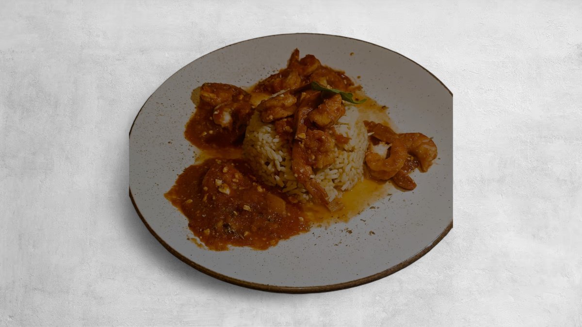 10 Black tiger King prawns 16/20 peeled cooked in the charcoal oven with a rich tomato sauce and grated feta cheeses served with rice and chips