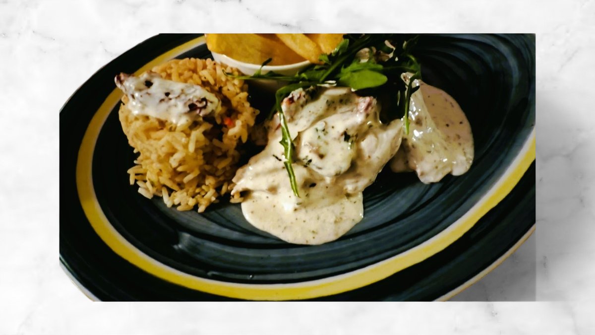 Chicken fillet stuffed with creamy cheese, sun dried tomatoes, bacon topped with creamy sauce. Served with rice and chips.