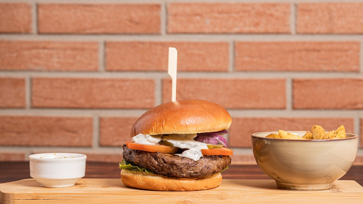 Delicious Burger 250 gr topped with Blue cheese sauce , red onion, lettuce tomato served with wedges and Texas slaw.