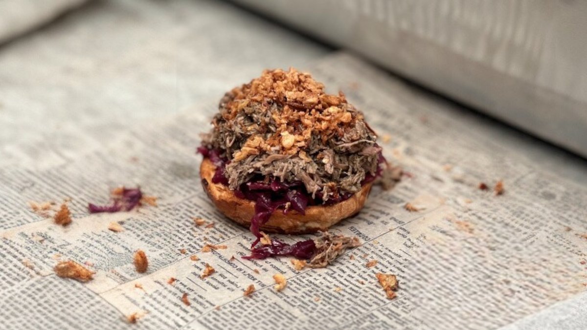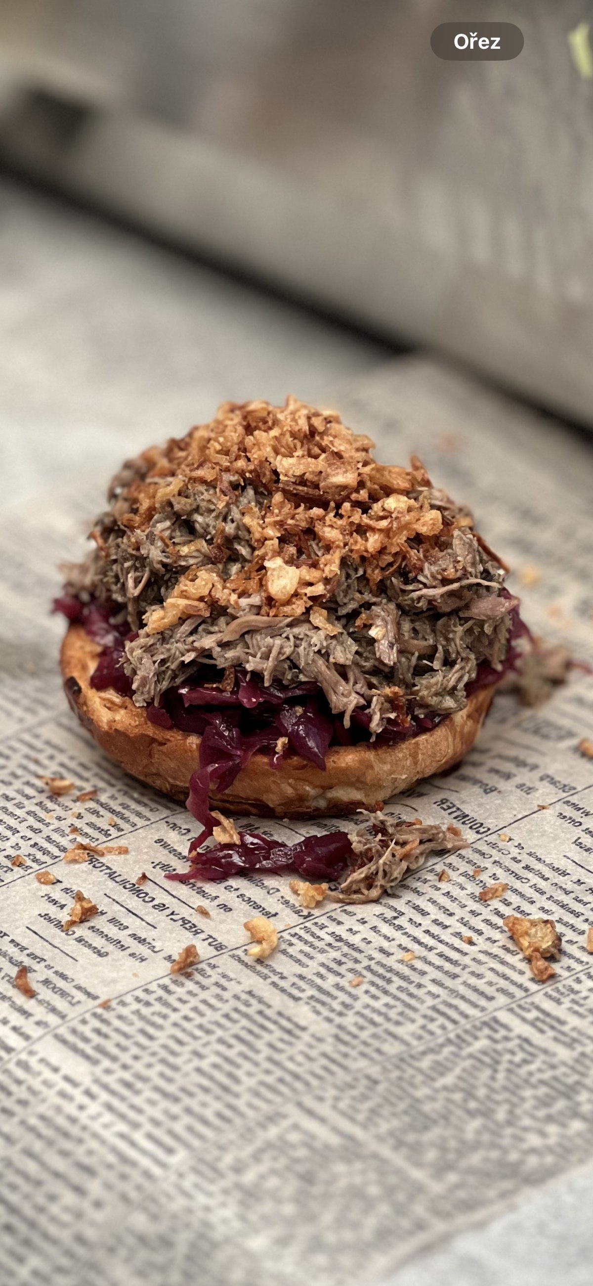 Máslová bulka, trhané kachní prso, červené zelí s povidly zahušťené strouhaným perníkem, smažená cibulka, výpek