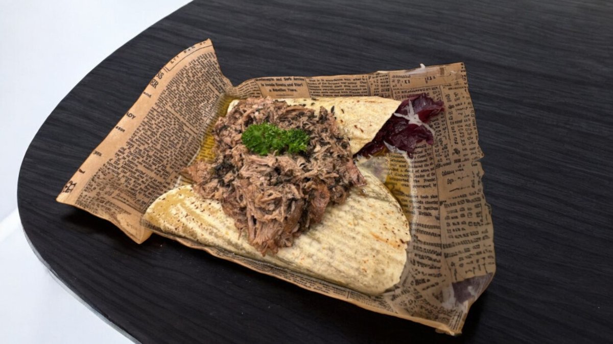 Pšeničná tortilla, naše vepřové trhané maso tažené 12 hodin ve vlastní šťávě, sýr cheddar, sýr mozzarella, grilovaná máslová kukuřice,.