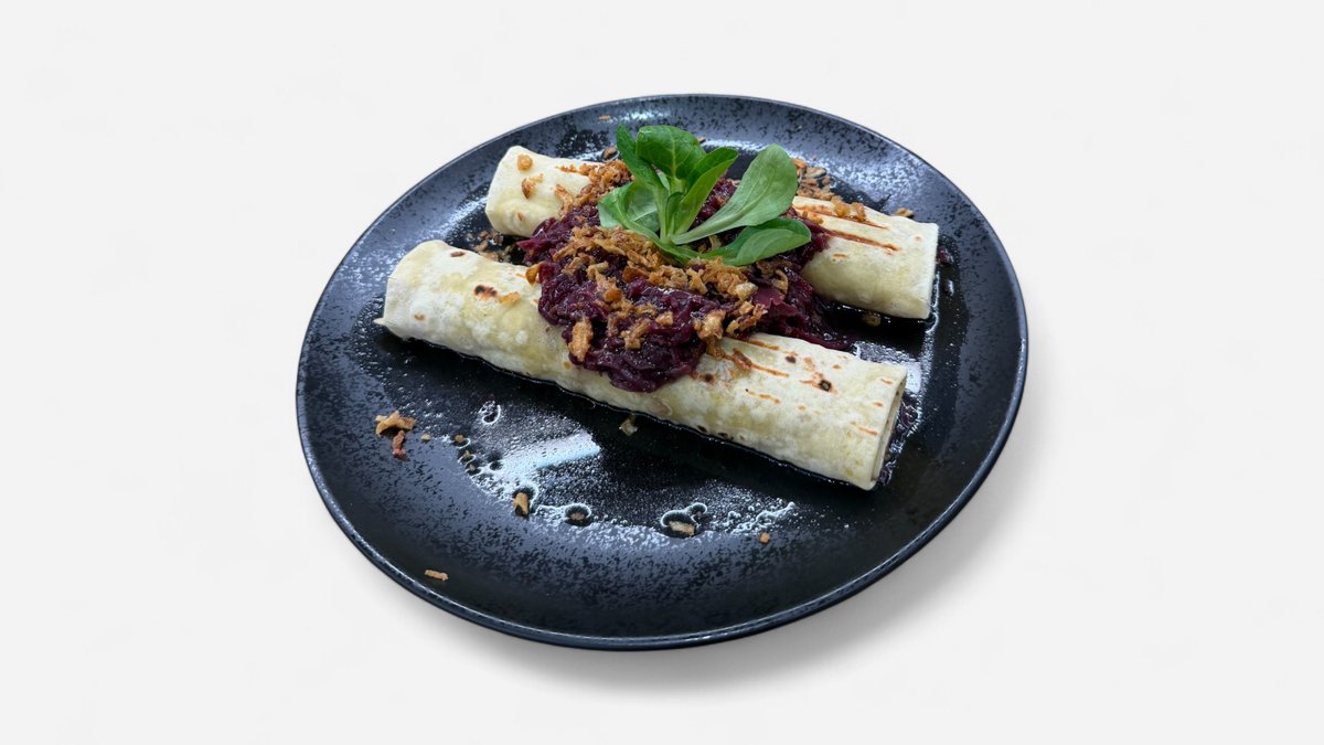 Bramborová lokše plněná červeným zelím s povidly a perníkem, trhaná kachní prsa, smažená cibulka, výpek, petrželka