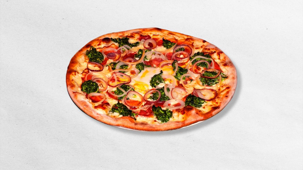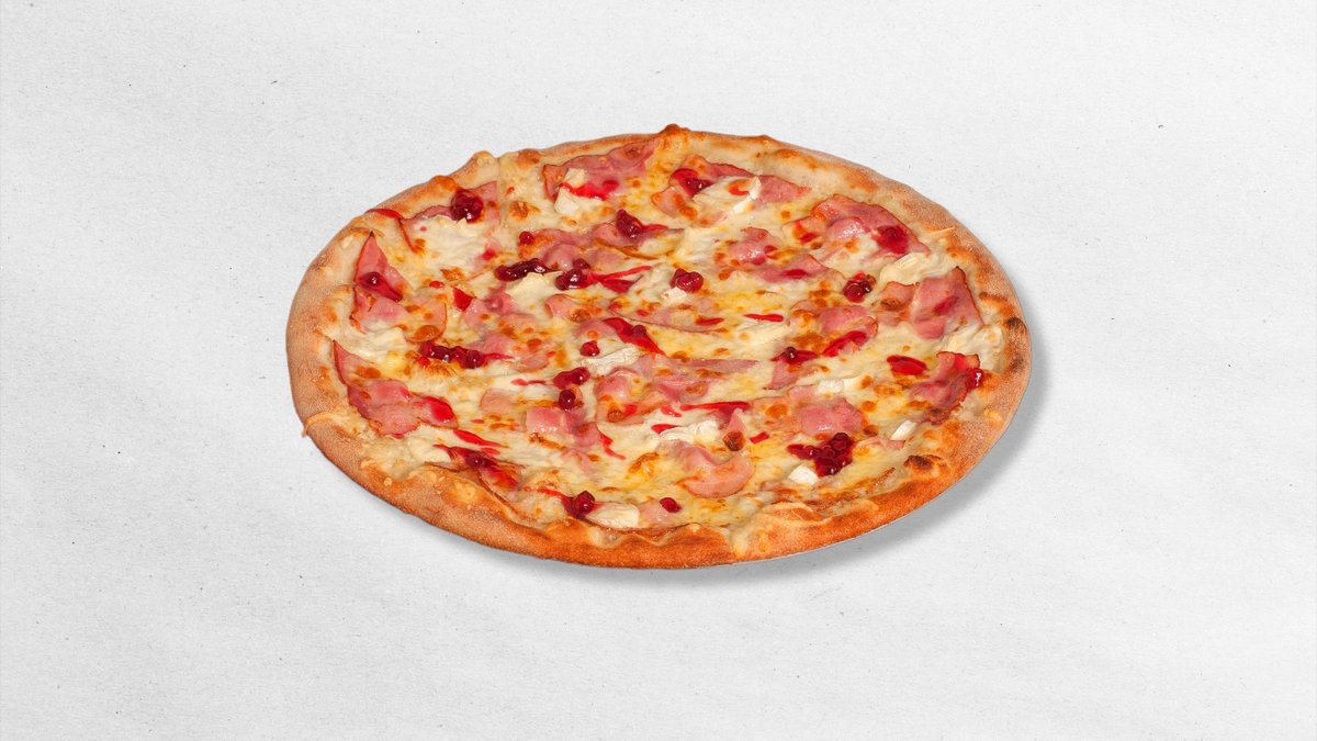 rajčatový základ, sýr mozzarella, bazalka, smetana, sýr parmezán, šunka cotto di Italia, slanina pancetta