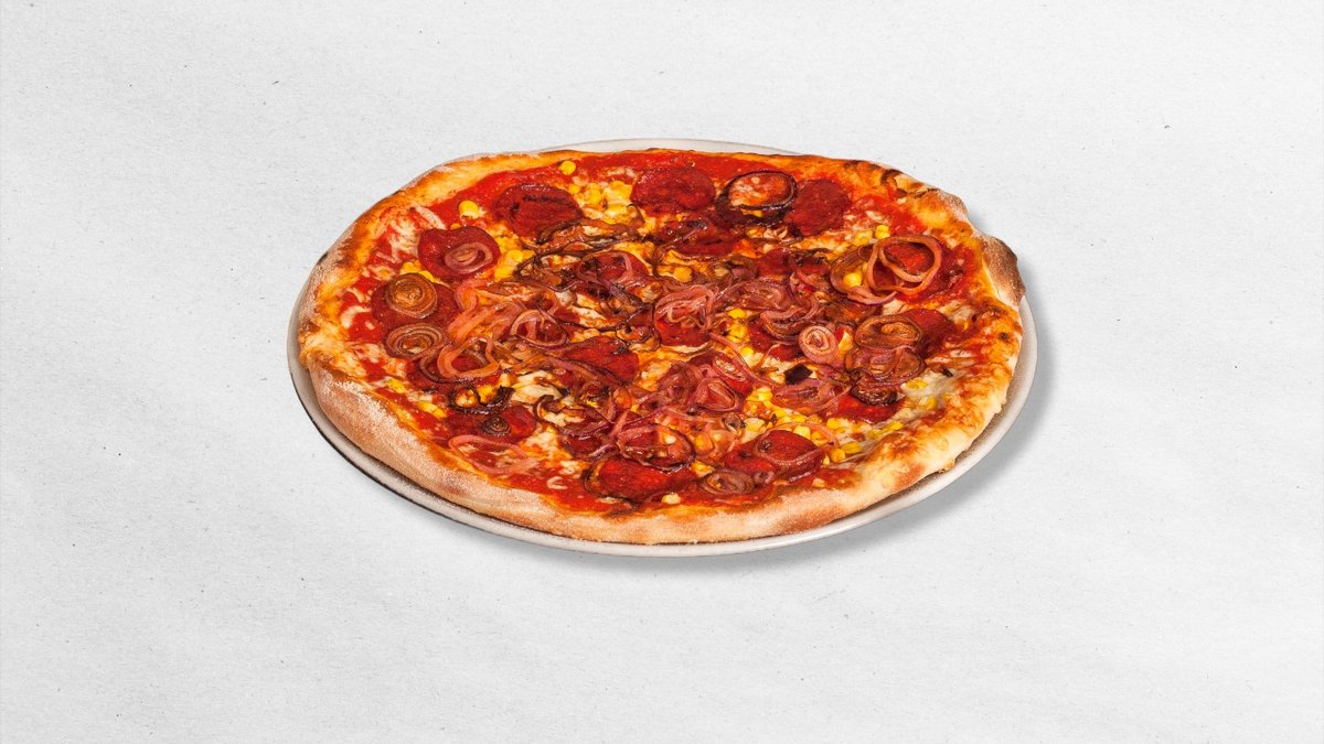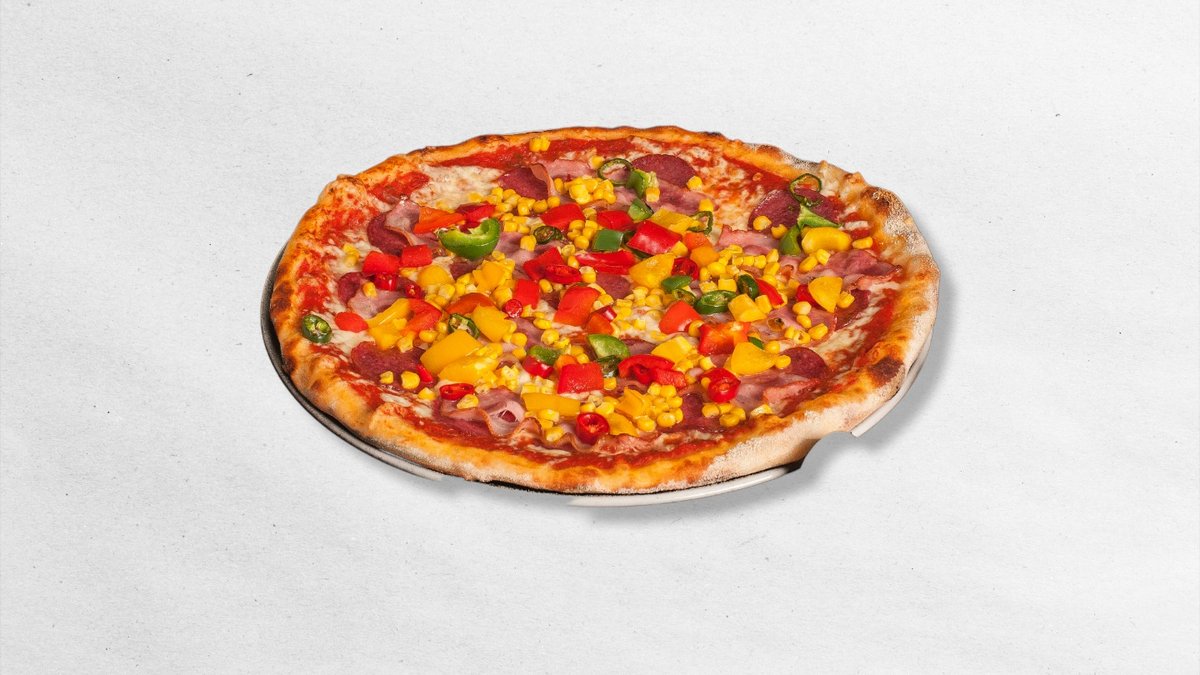 kukuřice, paprika, rajčatový základ, sýr eidam, žampiony, olivy černé