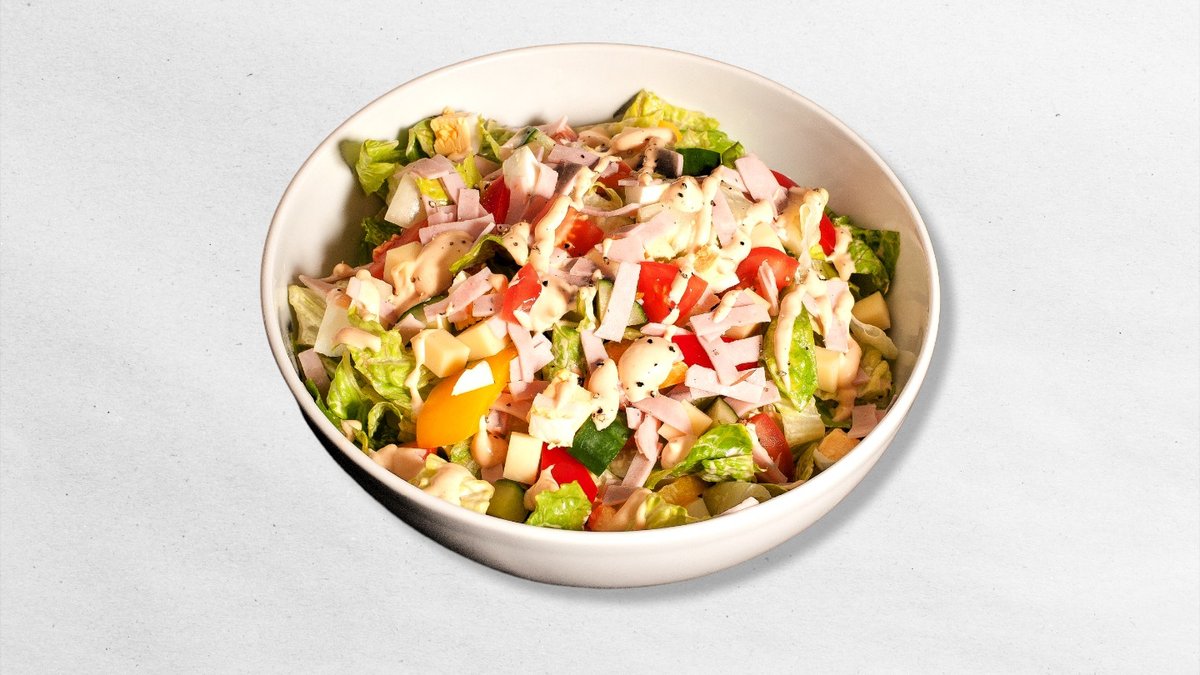 majonézový dresink, paprika, rajče, římský salát, salátová okurka, sýr eidam, šunka, vejce, 400g