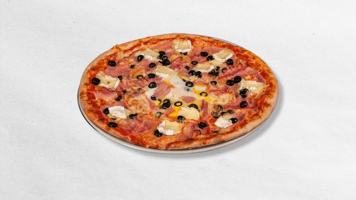 hermelín, olivy černé, rajčatový základ, sýr eidam, šunka, vejce, slanina