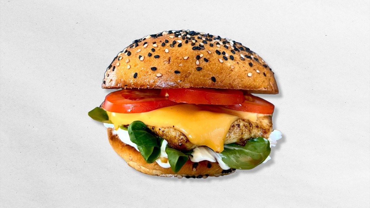 bulka, majonéza, rajče, sladká chilli omáčka, sýr cheddar, polníček, marinované kuřecí maso, 150g