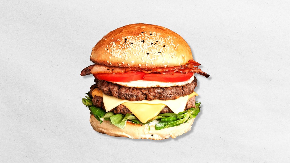 bulka, majonézový dresink, rajče, římský salát, salátová okurka, sýr cheddar 2x, dvojitá porce slaniny, mleté hovězí maso, 150g