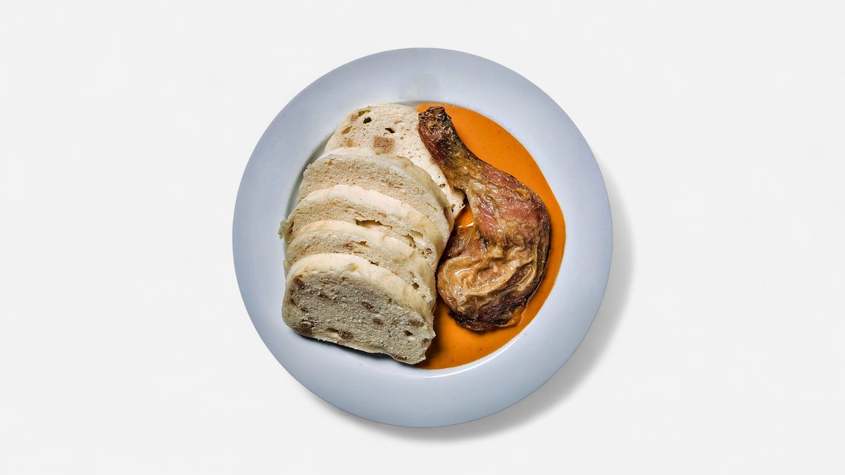 Složení: pečené kuřecí stehno (hrubá váha 220 g), omáčka (cibule, paprika maďarská, mouka, smetana), houskové knedlíky