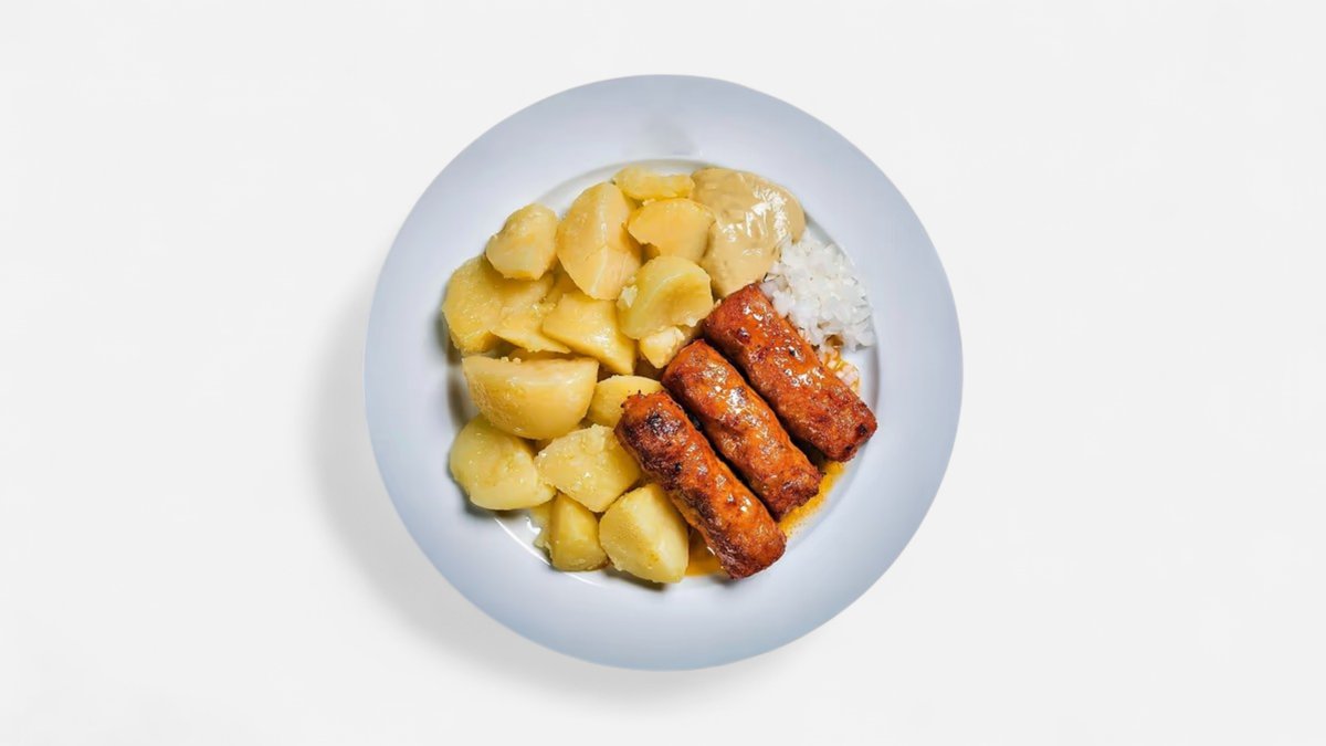 Čevapčiči s cibulí a hořčicí, vařené brambory