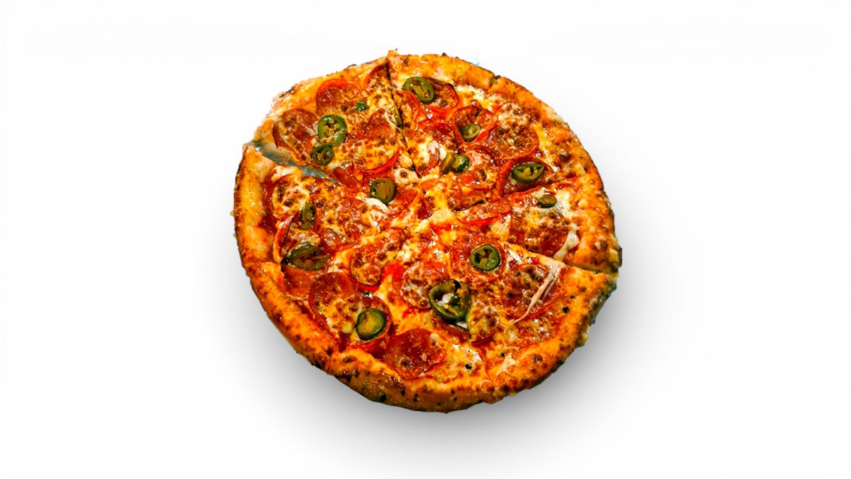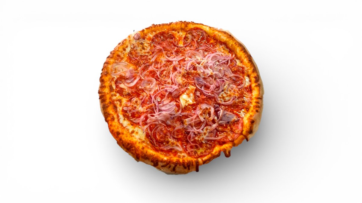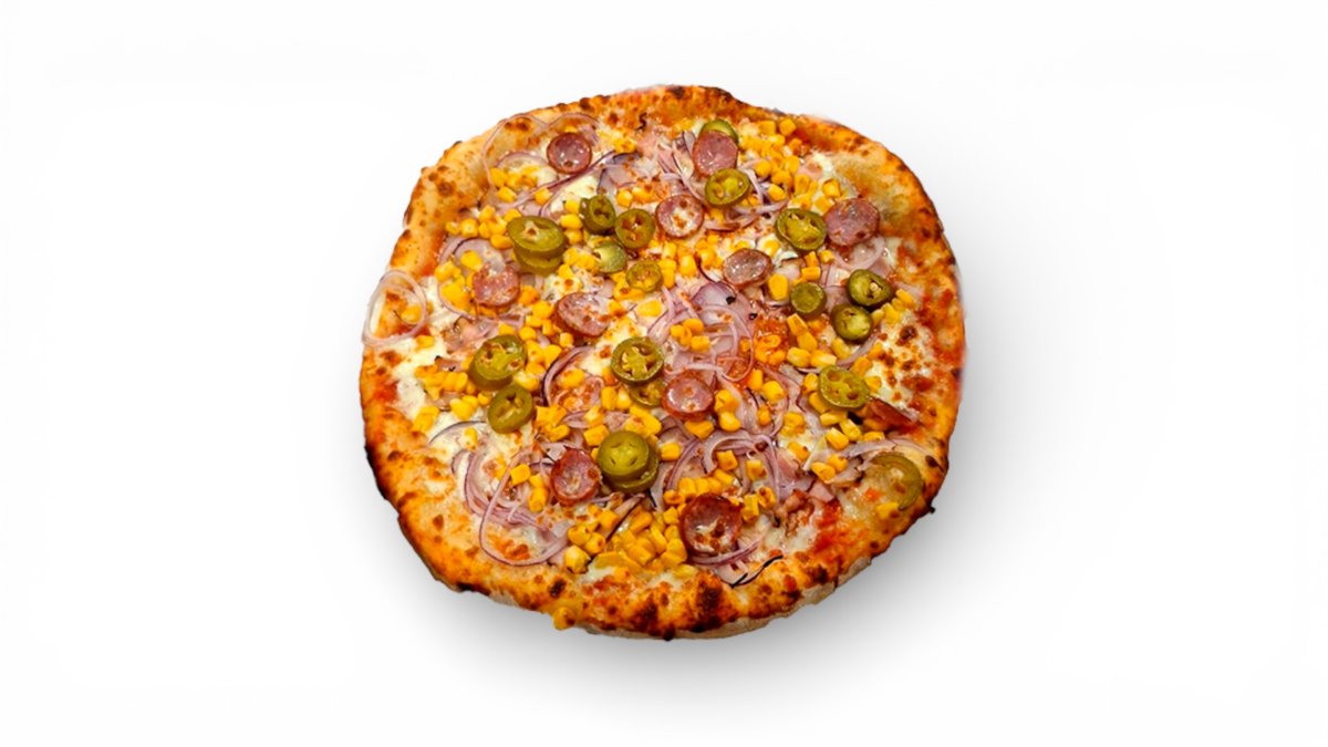 sugo, mozzarella, kukuřice, feferonky slanina, klobása, cibule
