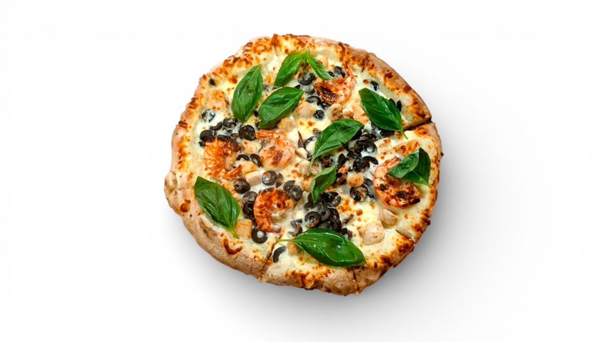 mozzarella, krevety kuřecí maso, olivy smetana, bazalka