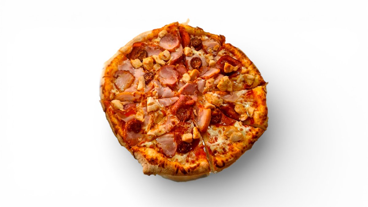 sugo, mozzarella, slanina, salám, šunka, kuřecí maso, klobása