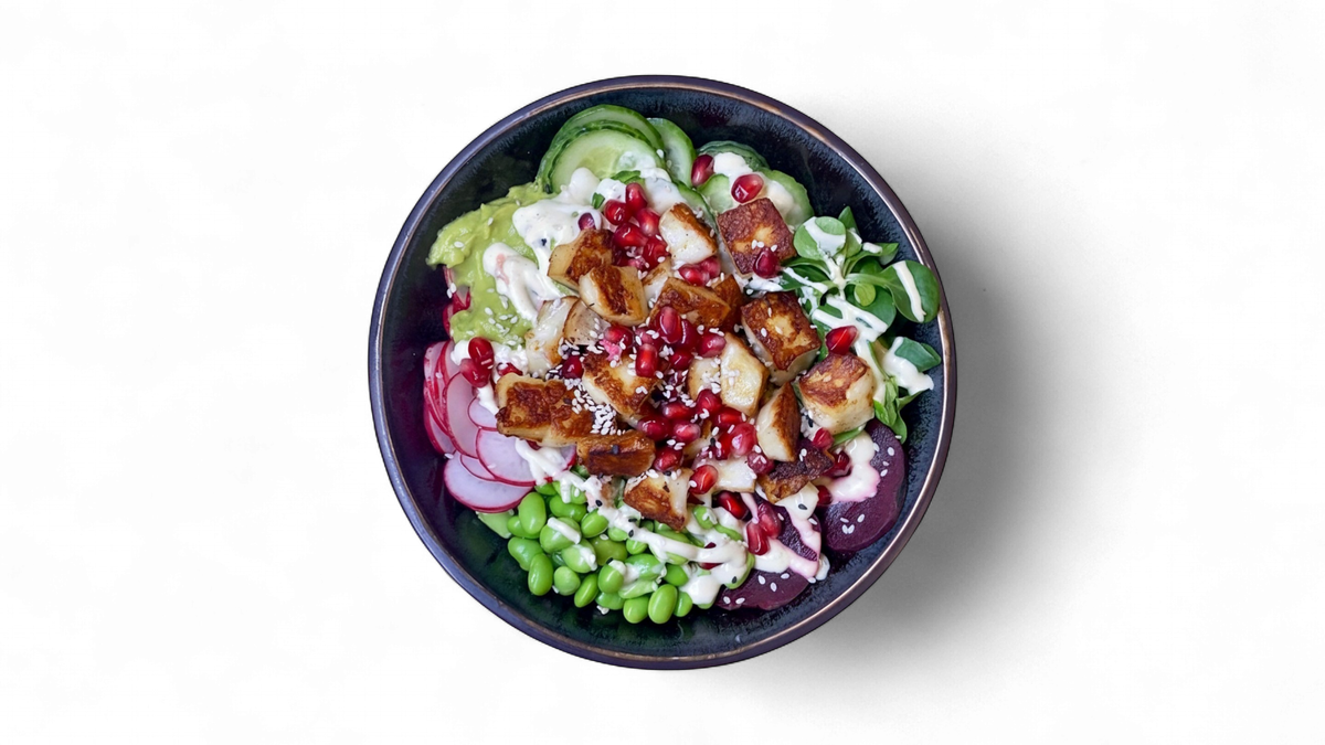 růžová sushi rýže, gril. losos nebo halloumi, bylinkovo - jogurtová mayo, okurky, polníček, edamame, ředkvičky, červená řepa, quacamole, granátové jablko, sezamová semínka