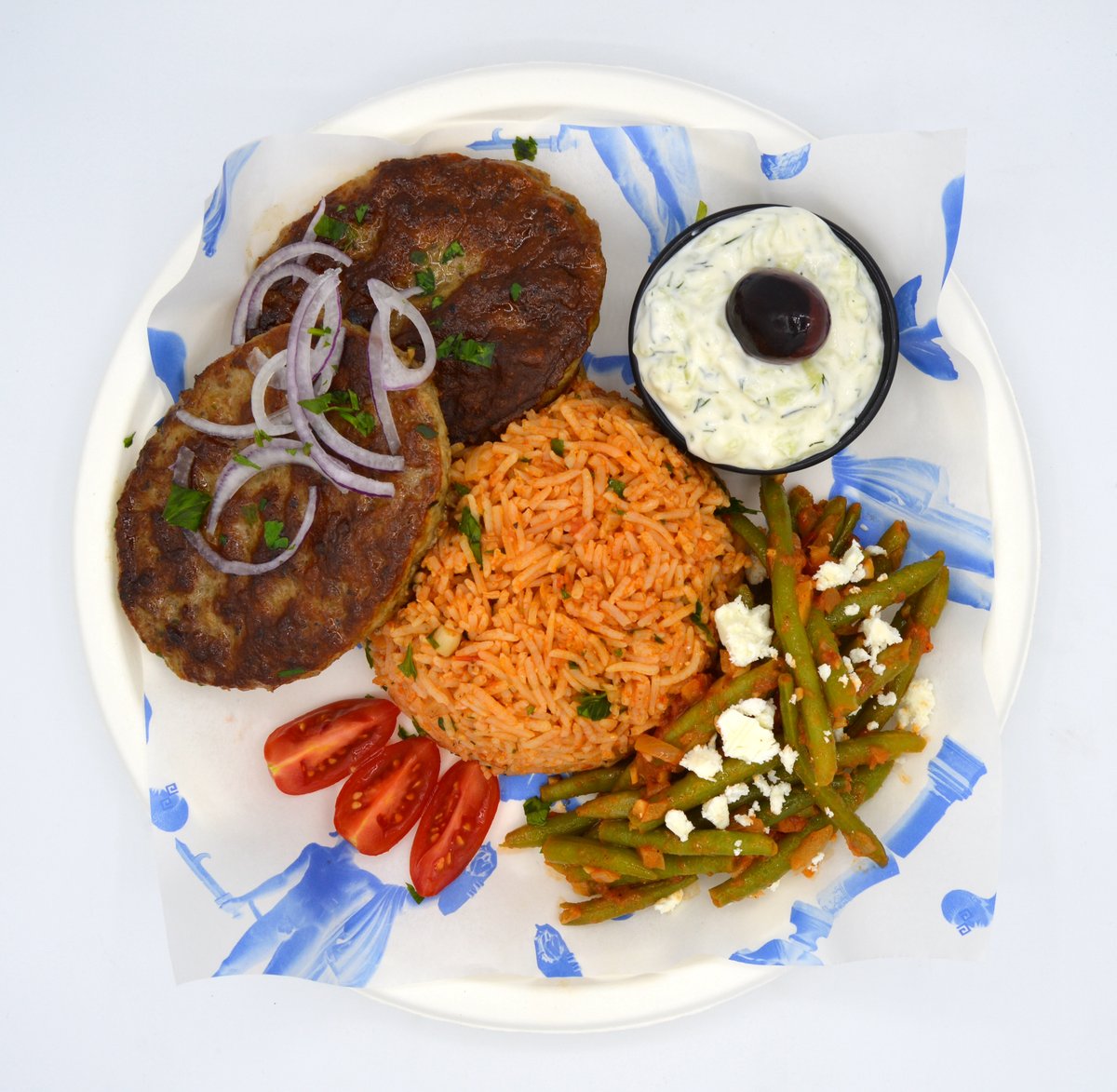 Tradiční mleté bifteky podávané s rajčatovou rýží/hranolkami, fazolkovým salátkem s rajčaty, fetou a tzatziky.