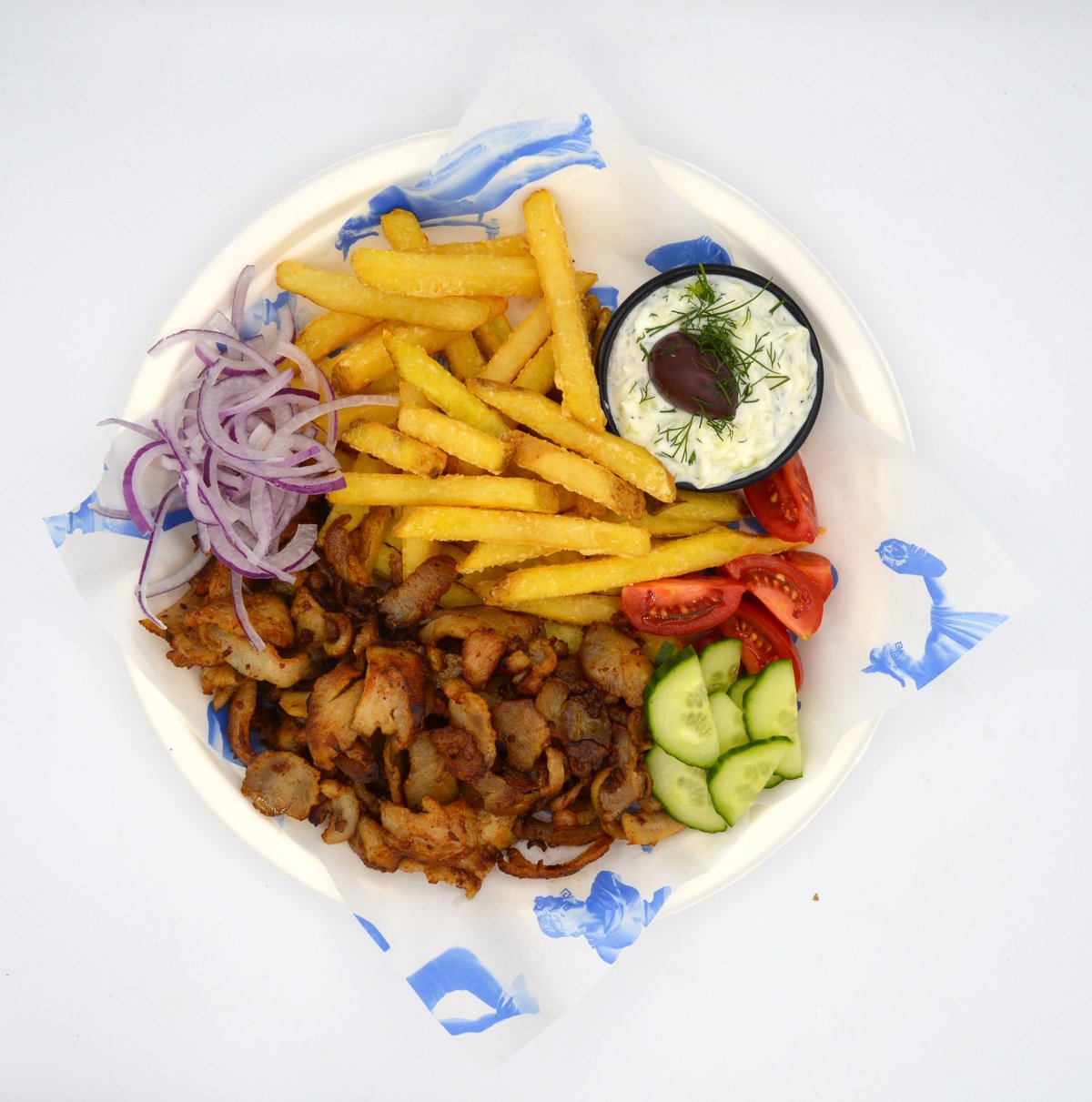 Talíř s vepřovým masem připravovaném na otočném grilu, hranolky, rajčata, cibule, okurky a tzatziky.