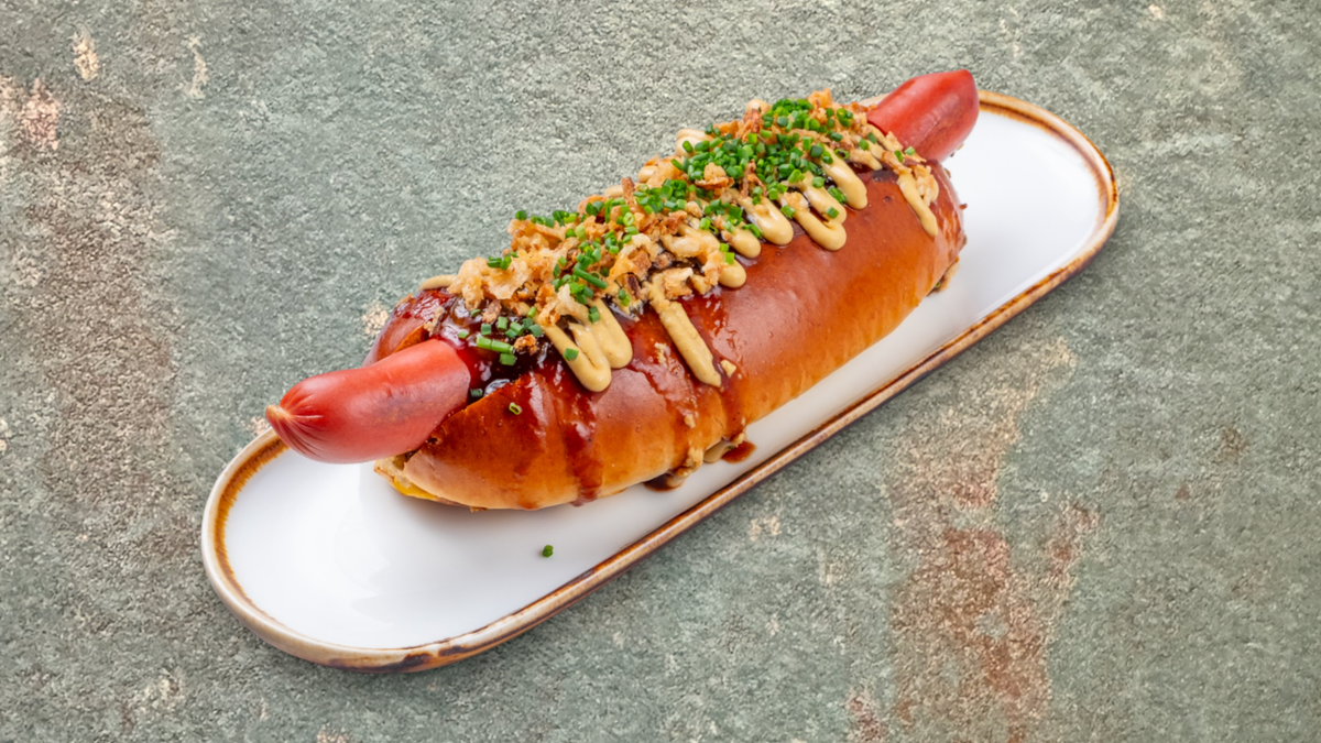 100 gramů okurkového relishu, medová hořčice, BBQ omáčka, smažená cibulka, pažitka