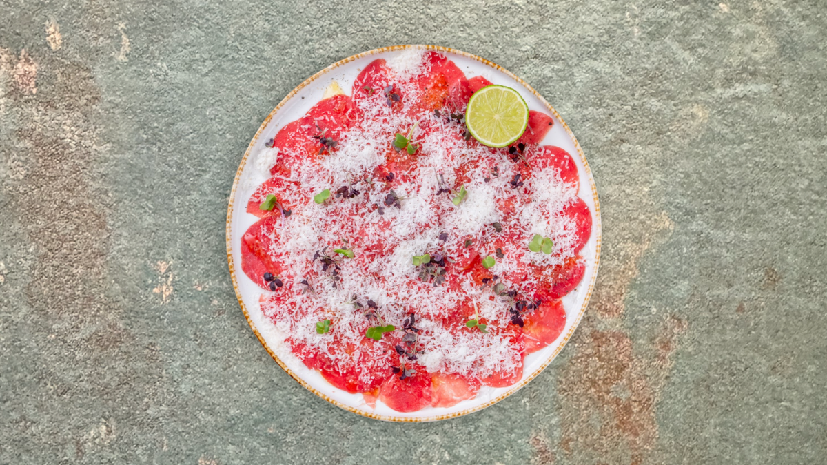 100 gramů carpaccio z hovězí svíčkové, mizuna, olivový olej, parmazán