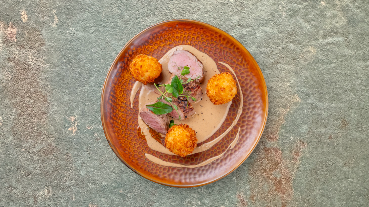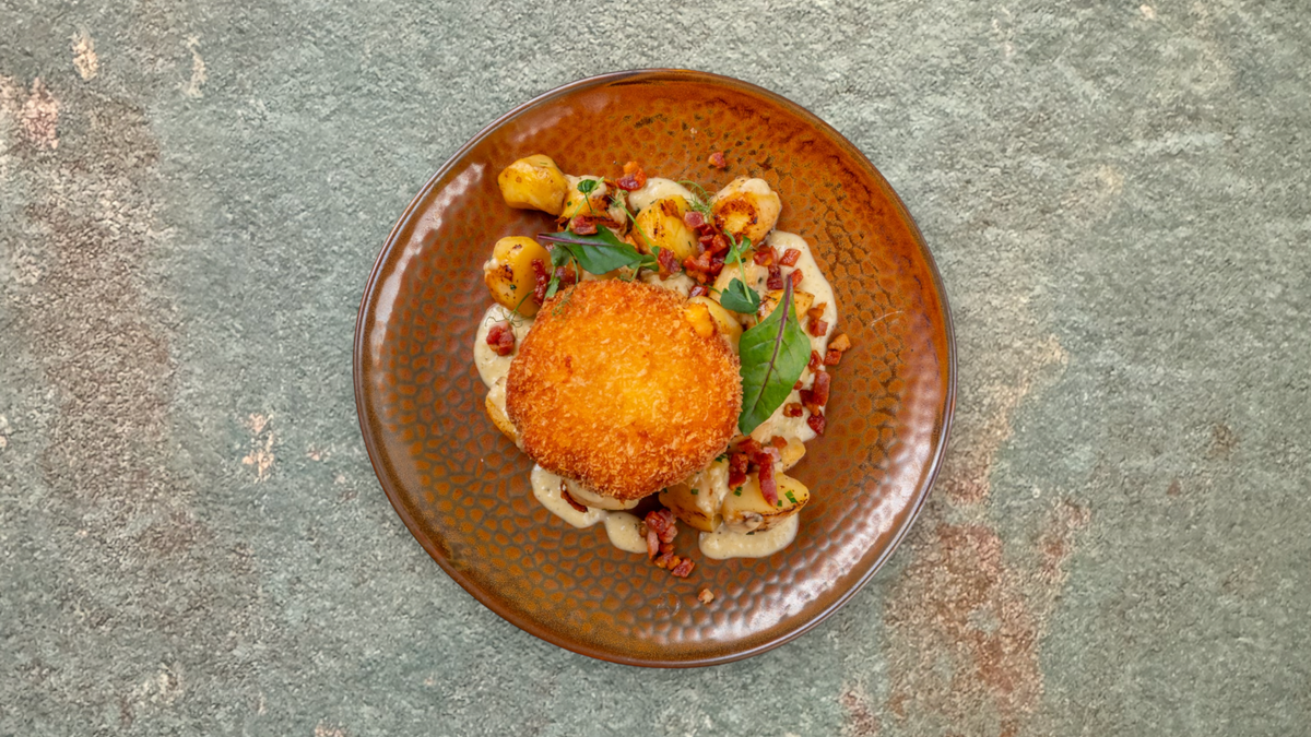 200 gramů smažená sýrová směs (cheddar, mozzarella, parmazán), crumble ze slaniny, máslové brambory, tatarská omáčka