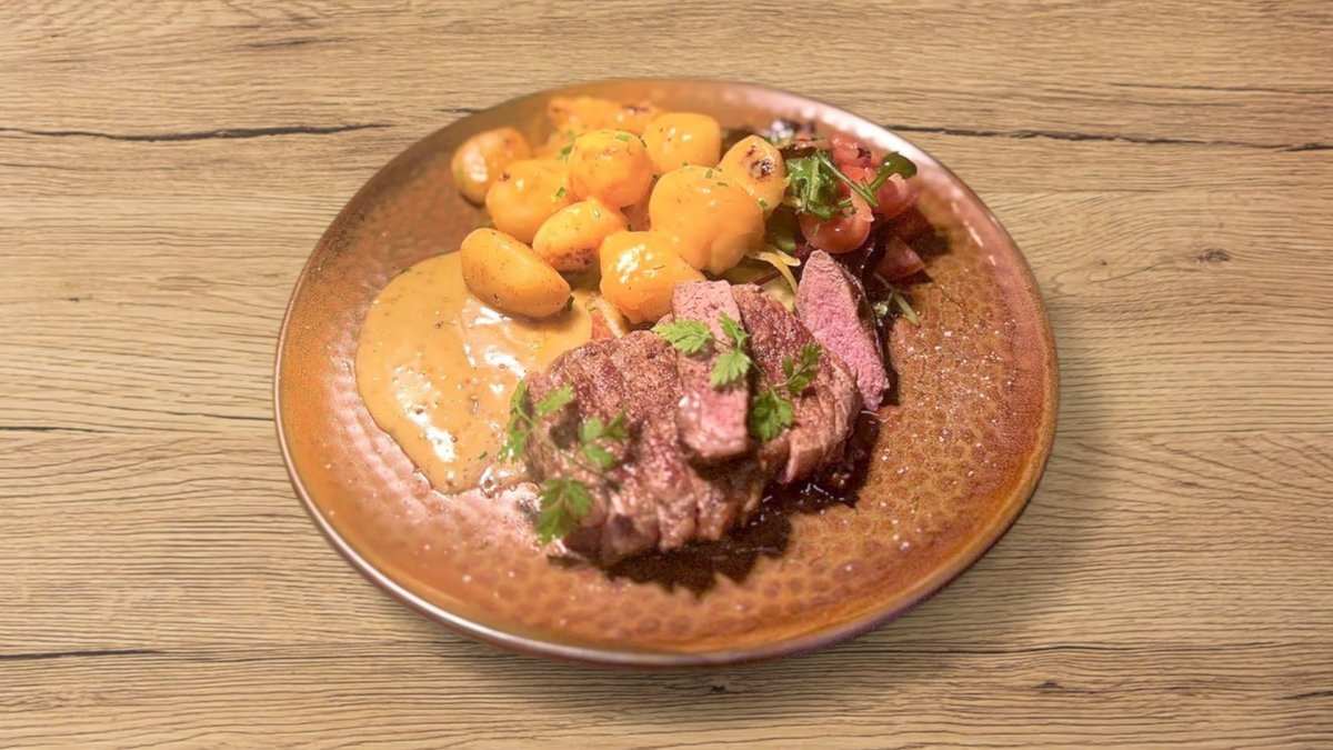 200g hovězí flank steak /IRL/, pečené brambory, pepřová omáčka