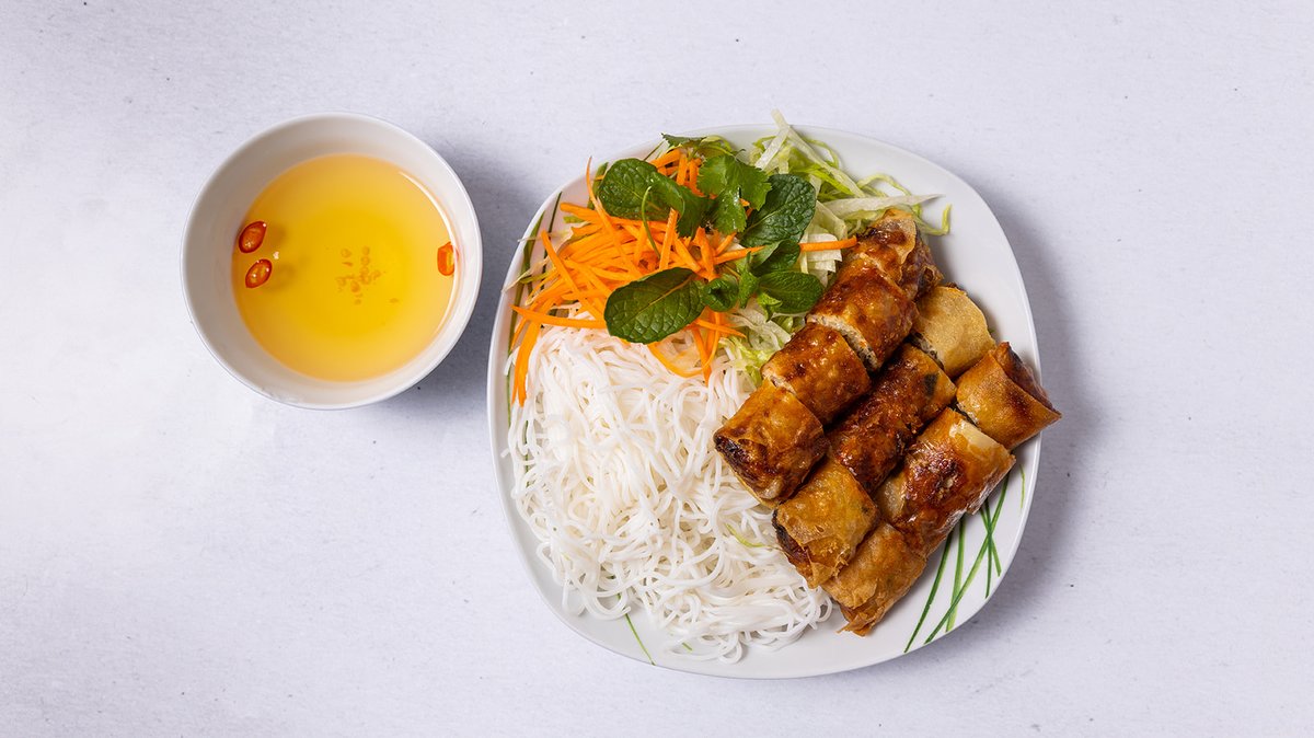 3ks jarní závitky, rýžové nudle, salát, bylinky, rybí omáčka