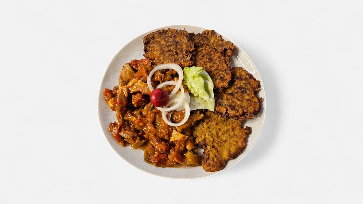 200g hovězí líčka, šťouchané brambory s cibulkou a slaninou