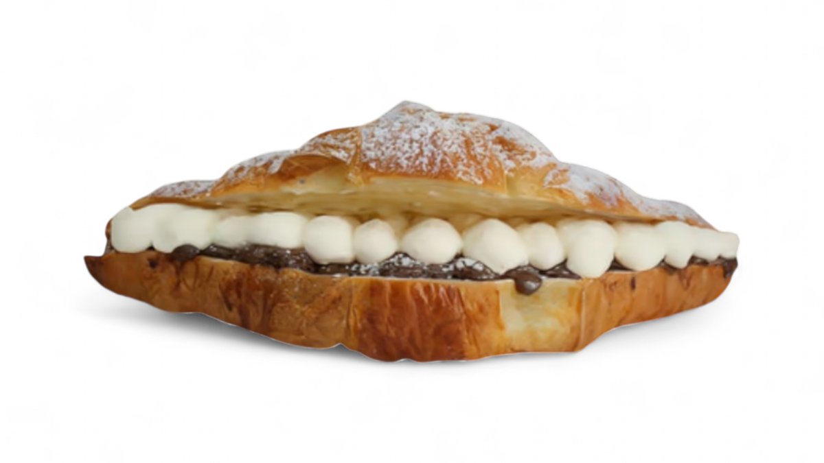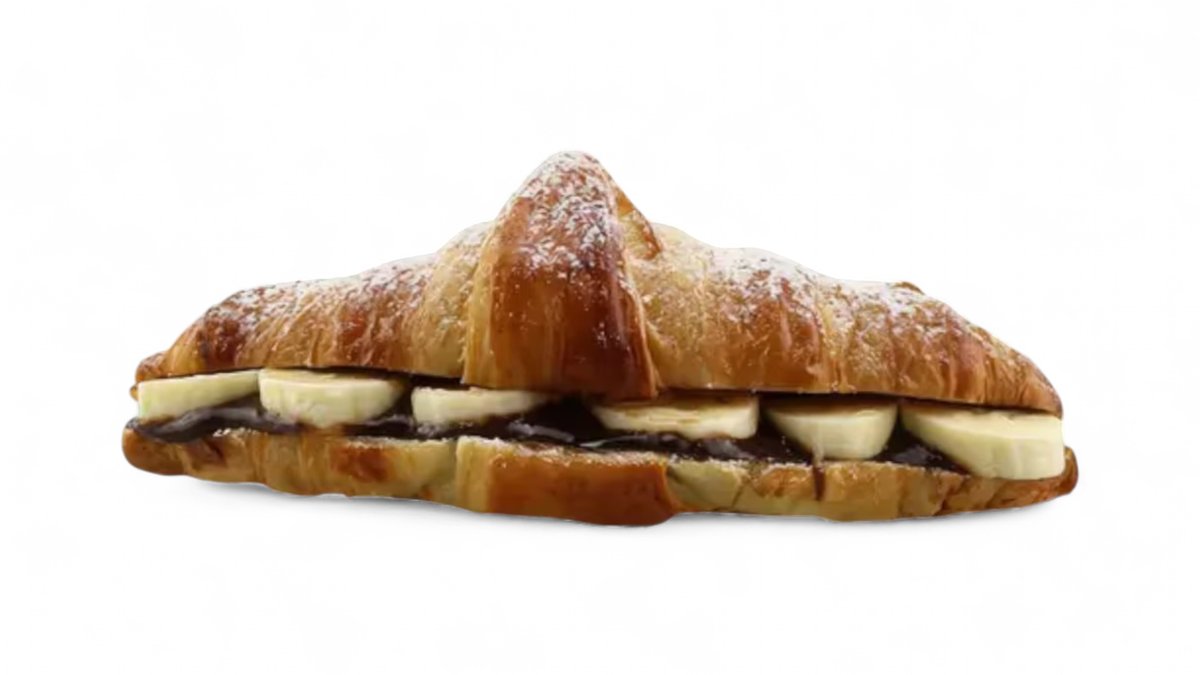 Croissant máslový, lískooříškový krém s kakaem, banán, moučkový cukr