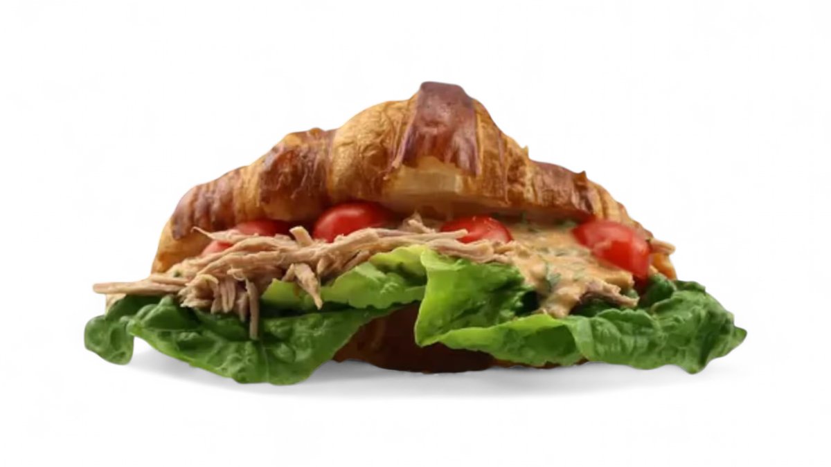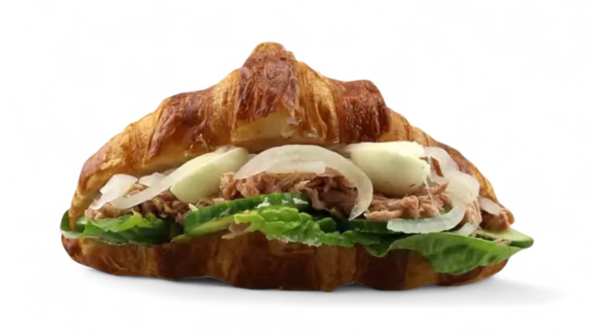 Croissant máslový, krémový sýr, salát romen, okurka, tuňák, křepelčí vejce, nakládaná cibule, majonézová omáčka s hořčicí, nebo olivový olej